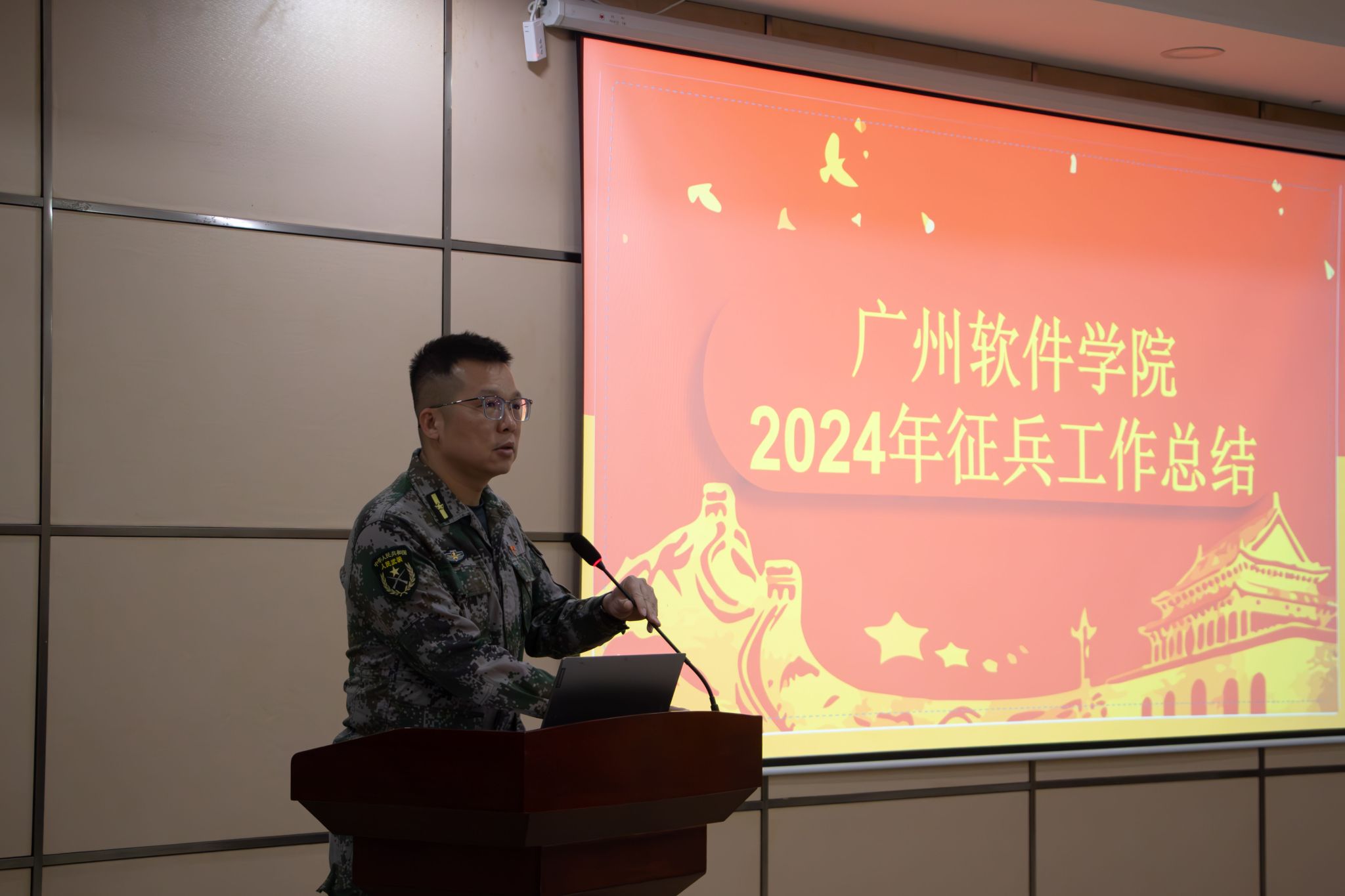 12月27日上午,广州软件学院2024征兵工作总结表彰暨2025年征兵工作动员大会在国际报告厅召开。学校党委书记刘友坤、党委副书记张广金,征兵工作领导小组成员,各二级学院党委书记、全体辅导员、退役复学学生代表等参加会议。会议由党委武装部副部长欧彦主持。