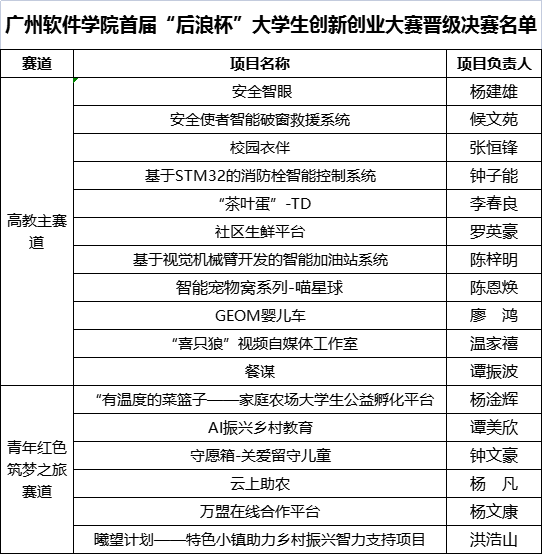 2021年4月,广州软件学院创新创业学院于联合广州市勇斗士教育科技有限公司举办广州软件学院首届“后浪杯”大学生创新创业大赛。我校积极宣传动员,经个人申报,组织专家综合评定,共确定以下17个参赛项目进入总决赛。其中,其中高教主赛道11个,红色筑梦之旅赛道6个。请通过初赛的各团队按照赛事相关要求,继续修改和完善作品,积极备战决赛,现将通过初赛的项目进行公示(排名不分先后,具体见附件)。