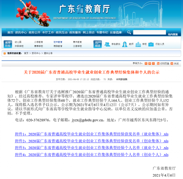 本次评选主要根据《广东省教育厅关于选树推广2020届广东省普通高校毕业生就业创业工作典型经验的通知》,经过高校推荐、专家评审等程序,遴选出2020届广东省普通高校毕业生就业工作典型经验集体72个、创业工作典型经验集体68个,就业工作典型经验个人164人、创业工作典型经验个人152人。公示期为2021年4月6日至4月12日(公示7天)。