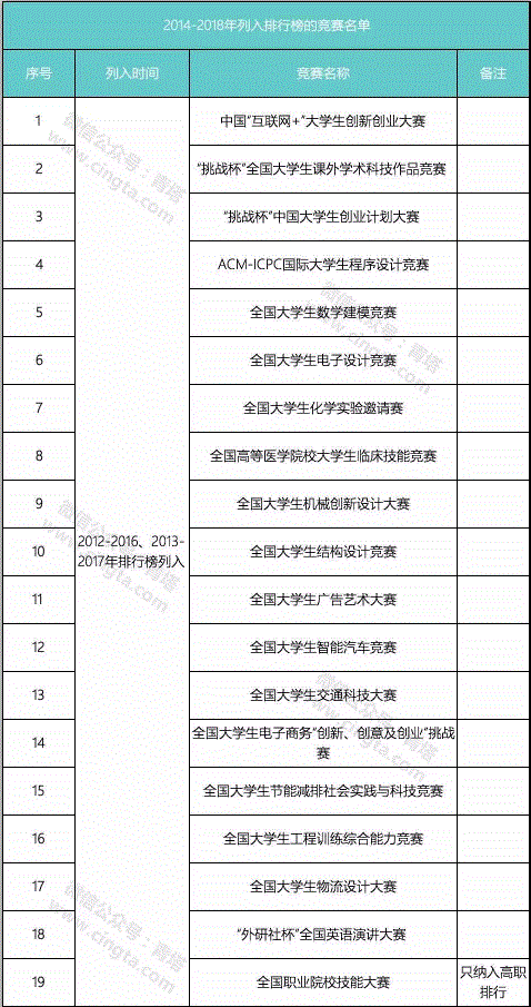 值得关注的是,2014-2018年我国普通高校学科竞赛排行榜的竞赛项目进行了扩容,新增15项竞赛纳入2014-2018年高校竞赛评估排行榜,其中本科类竞赛12项,高职类竞赛3项。本轮列入排行榜的竞赛项目从原来的“18+1”项扩容为“30+4” 项。其中,中国“互联网+”大学生创新创业大赛已成为全国大学生首屈一指的重要赛事。