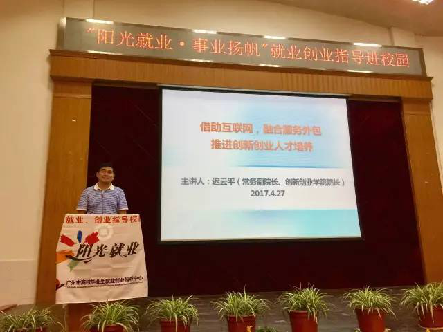 4月27日,华软学院常务副院长、创新创业学院院长迟云平,对外联络办公室副主任王佩锋受邀参加广东白云学院“阳光就业,事业扬帆”就业创业指导进校园活动,迟院长作题为《借助互联网,融合服务外包推进创新创业人才培养》的主题报告。广东白云学院创新创业学院杨辉主任、创新创业指导教师、创业团队、学生代表等200余人参加了报告会。