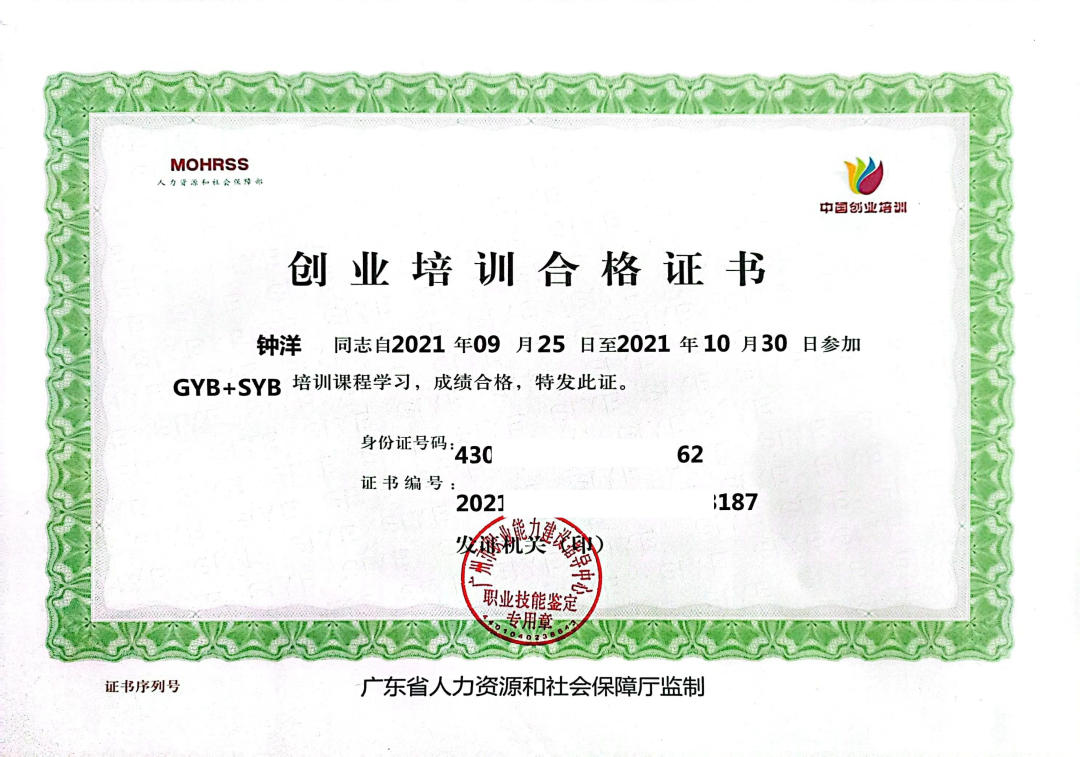 学员合格结业后可获得由广州市职业能力培训指导中心颁发的《创业培训(SYB)合格证书》。