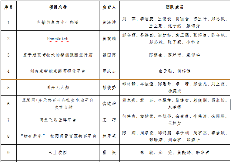 根据《广东省教育厅关于举办第四届中国“互联网+”大学生创新创业大赛广东省分赛暨第二届粤港澳大湾区大学生创新创业项目对接洽谈活动的通知》粤教毕函【2018】9号文件精神,进一步激发高校学生创新创业热情,展示高校创新创业教育成果,搭建大学生创新创业项目与社会投资对接平台,我院举办了第四届中国“互联网+”大学生创新创业大赛华软学院校赛。经校赛组委会组织评审团评审,最终12支创业团队入围第四届中国“互联网+”大学生创新创业大赛华软学院入围省赛名单。现将大赛评审结果公示如下(排名不分先后):