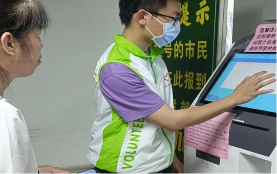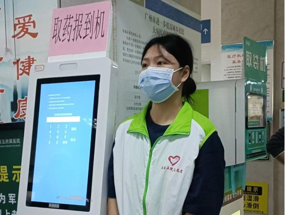 取药报到机的工作主要是引导患者使用条形码签到后到指定窗口排队取药,及时解答患者的疑问。签到好像是一份轻松的工作,但其实并非如此。到院的患者大多都是老年人和第一次使用签到机的患者,所以签到机经常排满着人。这需要志愿者打起精神认真帮助患者使用机器签到,并指引患者到指定窗口排队取药。