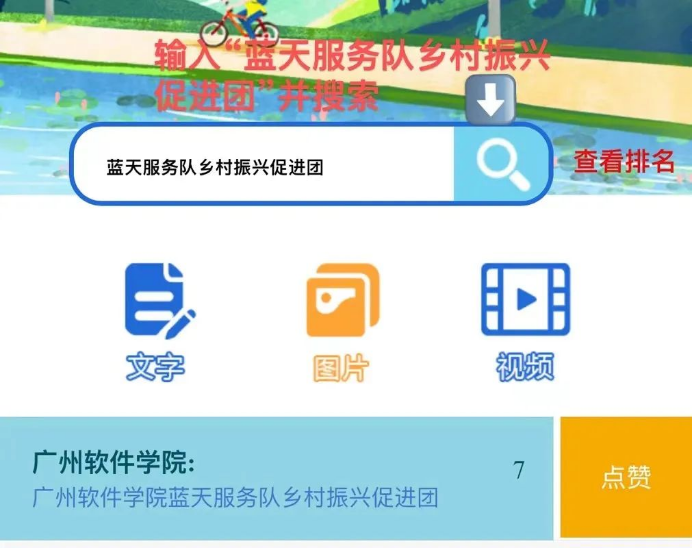 以下是点赞的时间以及详细流程,快来为“蓝天服务队乡村振兴促进团”助力吧!