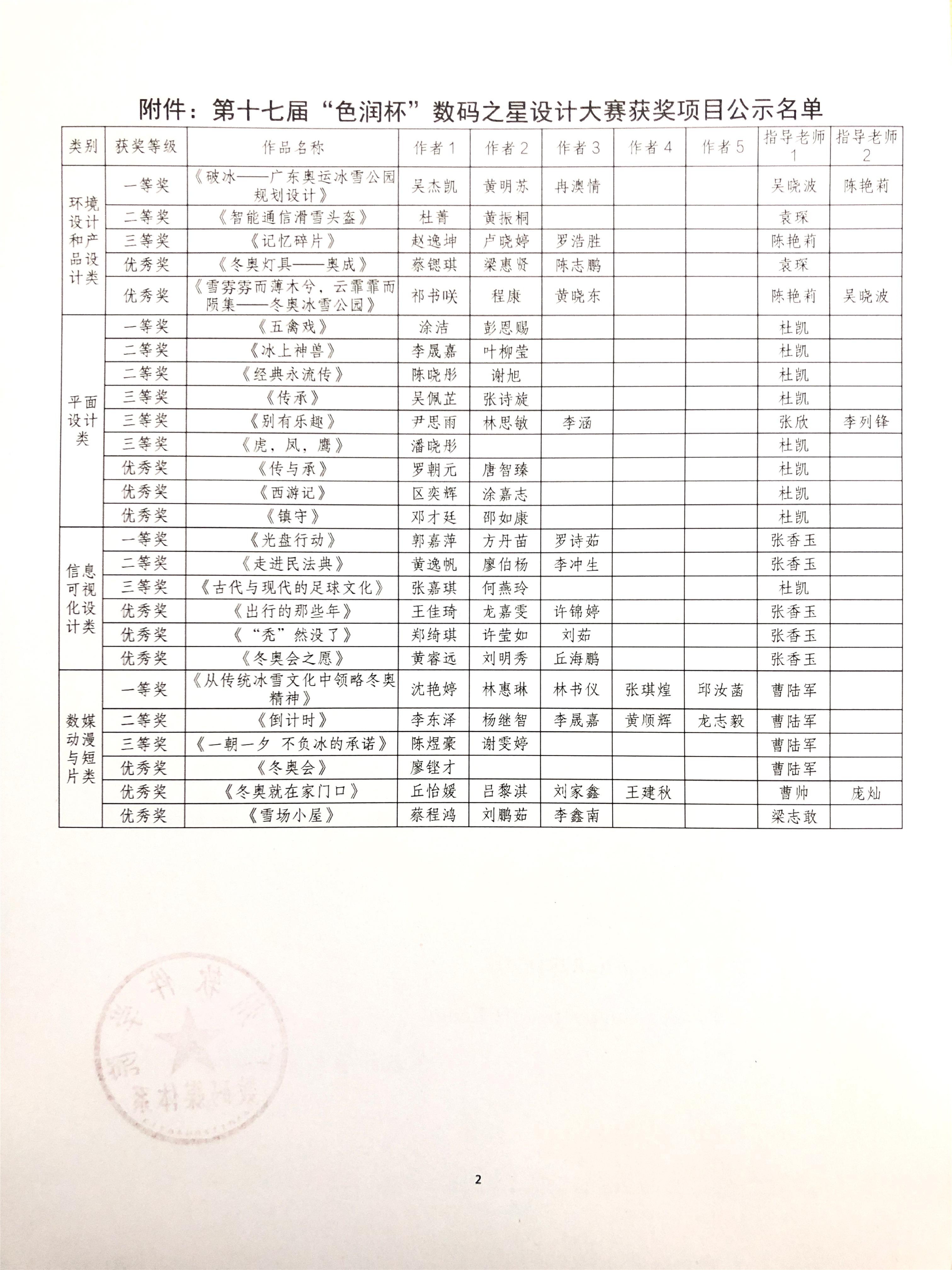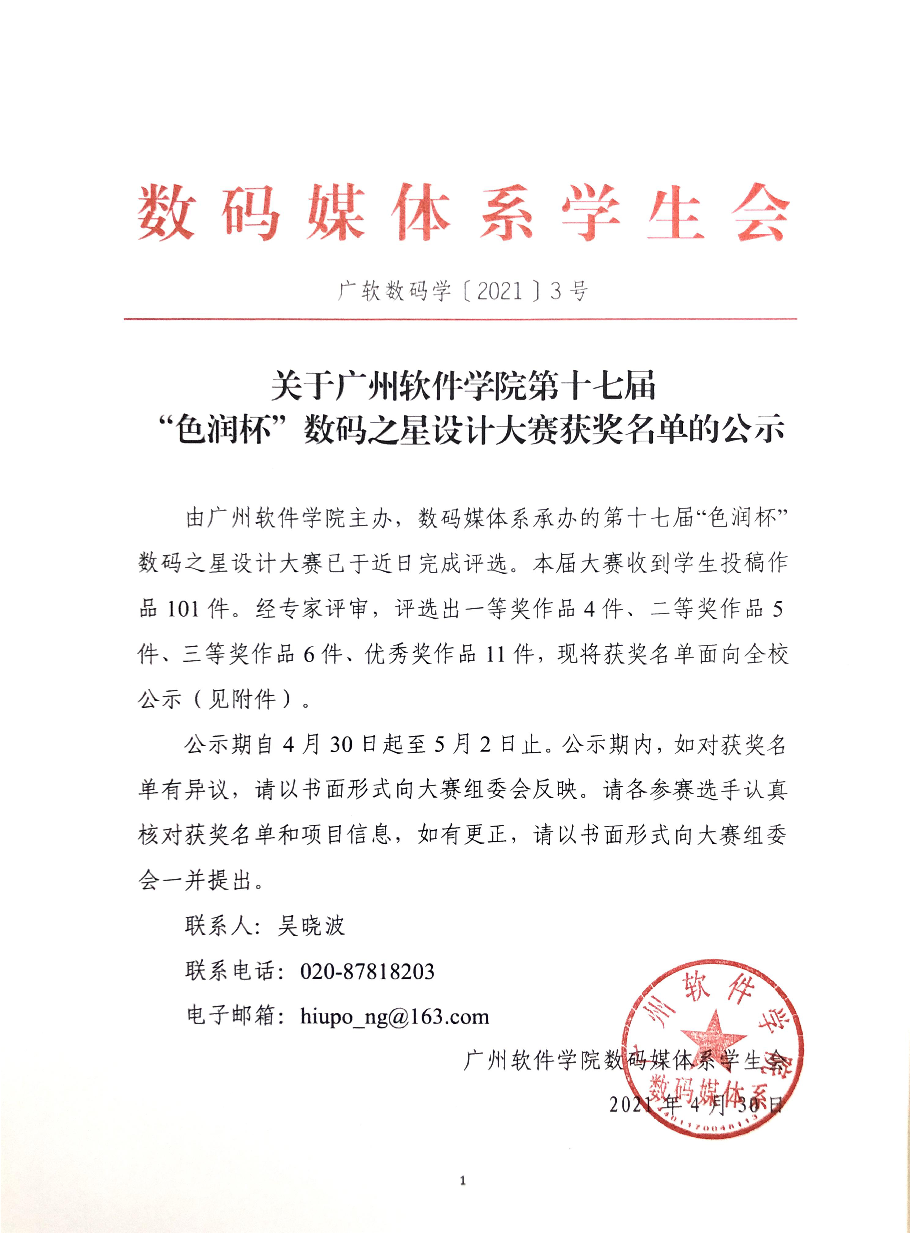 关于广州软件学院第十七届“色润杯”数码之星设计大赛获奖名单的公示