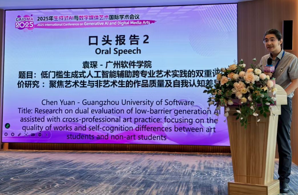 2025 年 9 月 12 日至 14 日,由桂林电子科技大学主办,阿坝师范学院、马来西亚理工大学、新加坡机器人学会及 AEIC 学术交流中心联合支持的 2025 年生成式 AI 与数字媒体艺术国际学术会议(GAIDMA 2025)在广西桂林召开。广州软件学院创意设计学院产品设计专业负责人袁琛与骨干教师吴凡共同参会。袁琛老师受邀担任大会主持人,并发表主题学术报告。
