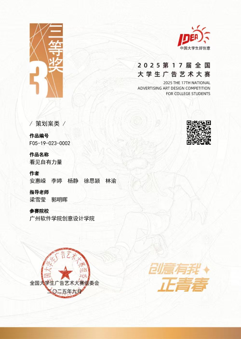 近日,第17届全国大学生广告艺术大赛(简称“大广赛”)全国总决赛获奖名单正式揭晓,创意设计学院学子以卓越的创意表现与扎实的专业功底,在激烈竞争中脱颖而出,共斩获国家级奖项3项、省级奖项20项。其中,作品《看见自有力量》荣获全国三等奖,《龈炎退散广寒静,齿健生辉中秋明》和《可画魔力A1,让灵感无限绽放》荣获全国优秀奖,充分展现了学院在广告艺术教育领域的深厚积淀与创新活力。