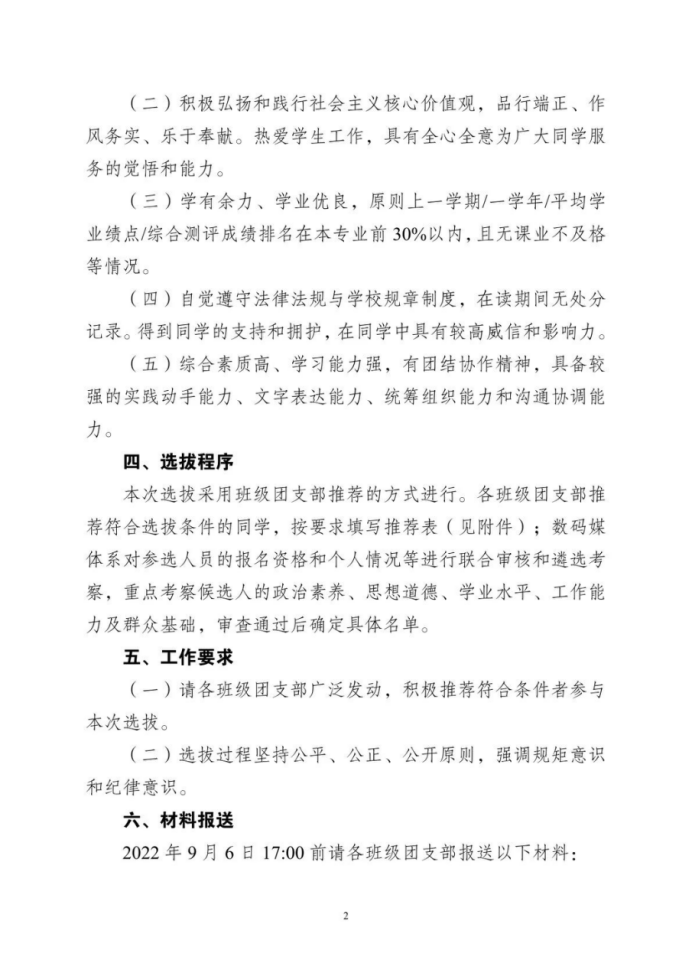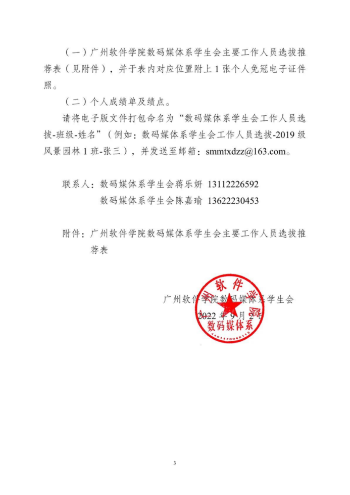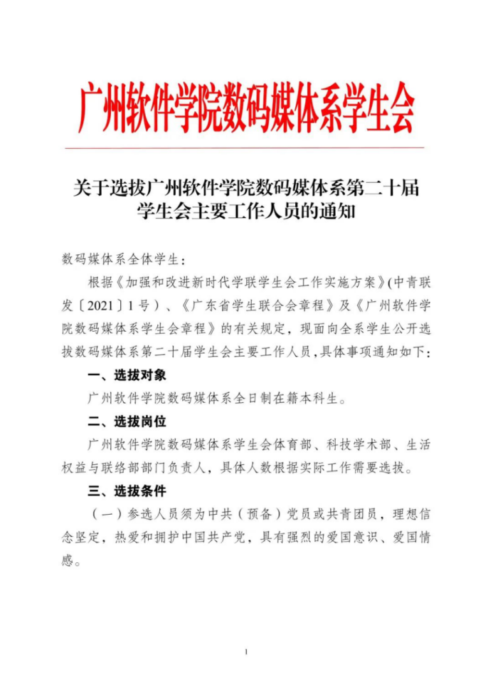 关于选拔广州软件学院数码媒体系第二十届学生会主要工作人员的通知