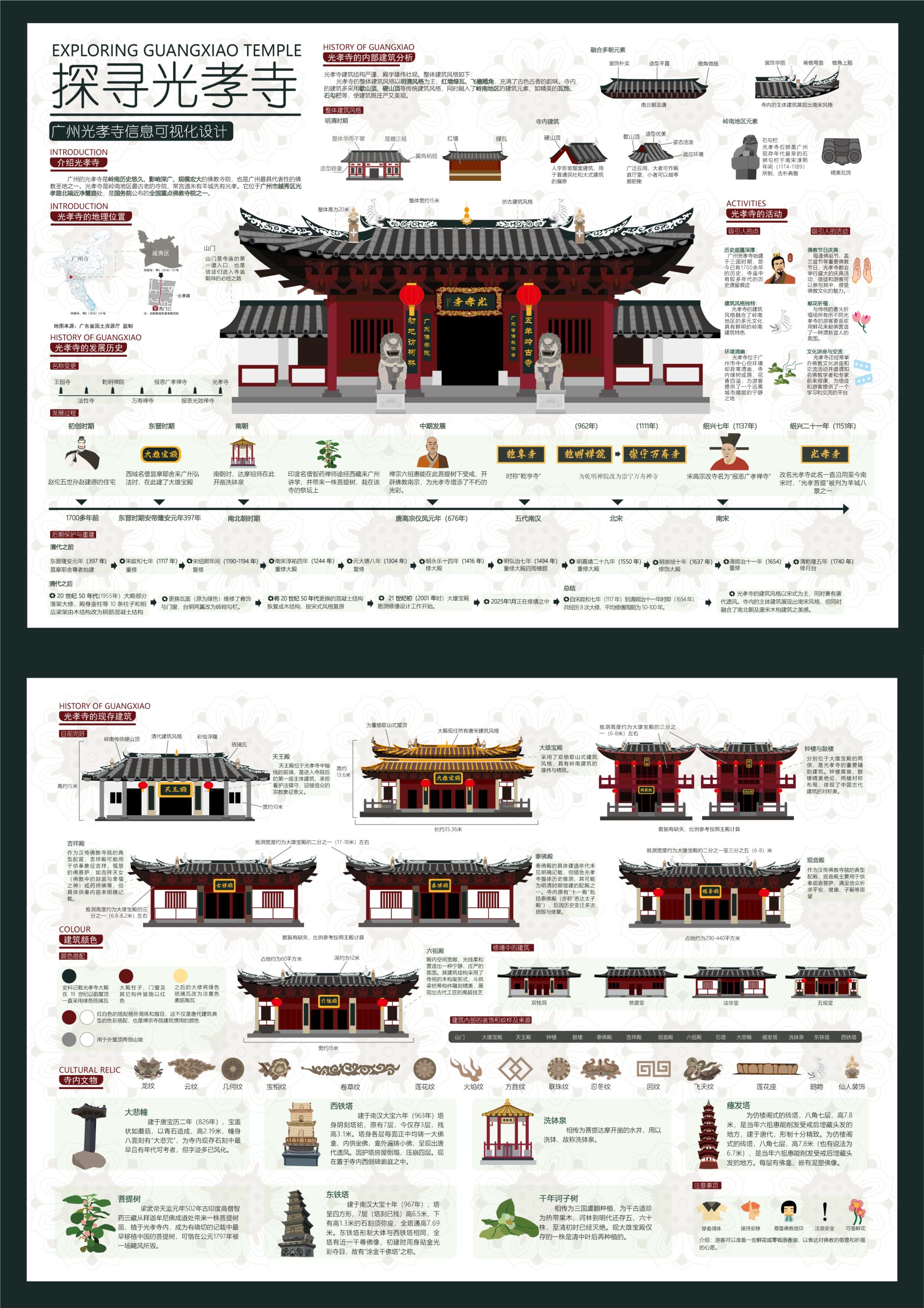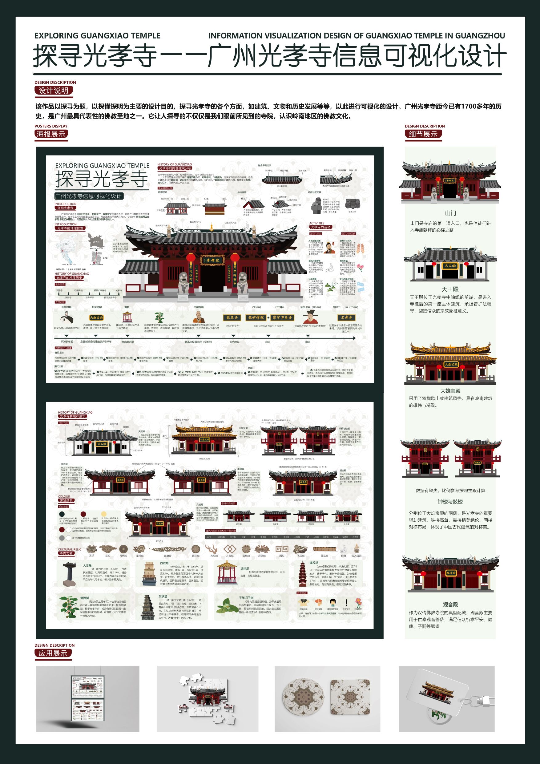 该作品以探寻为题,以碳度探明为主要设计目的,探寻光孝寺的各个方面,如建筑文物和历史发展等等以此进行可视化的设计。广州光孝寺距今已有1700多年的历史,是广州最具代表的佛教圣地之一,它让人探寻的不仅仅是我们野区所见到的寺院更是岭南地区的佛教文化。