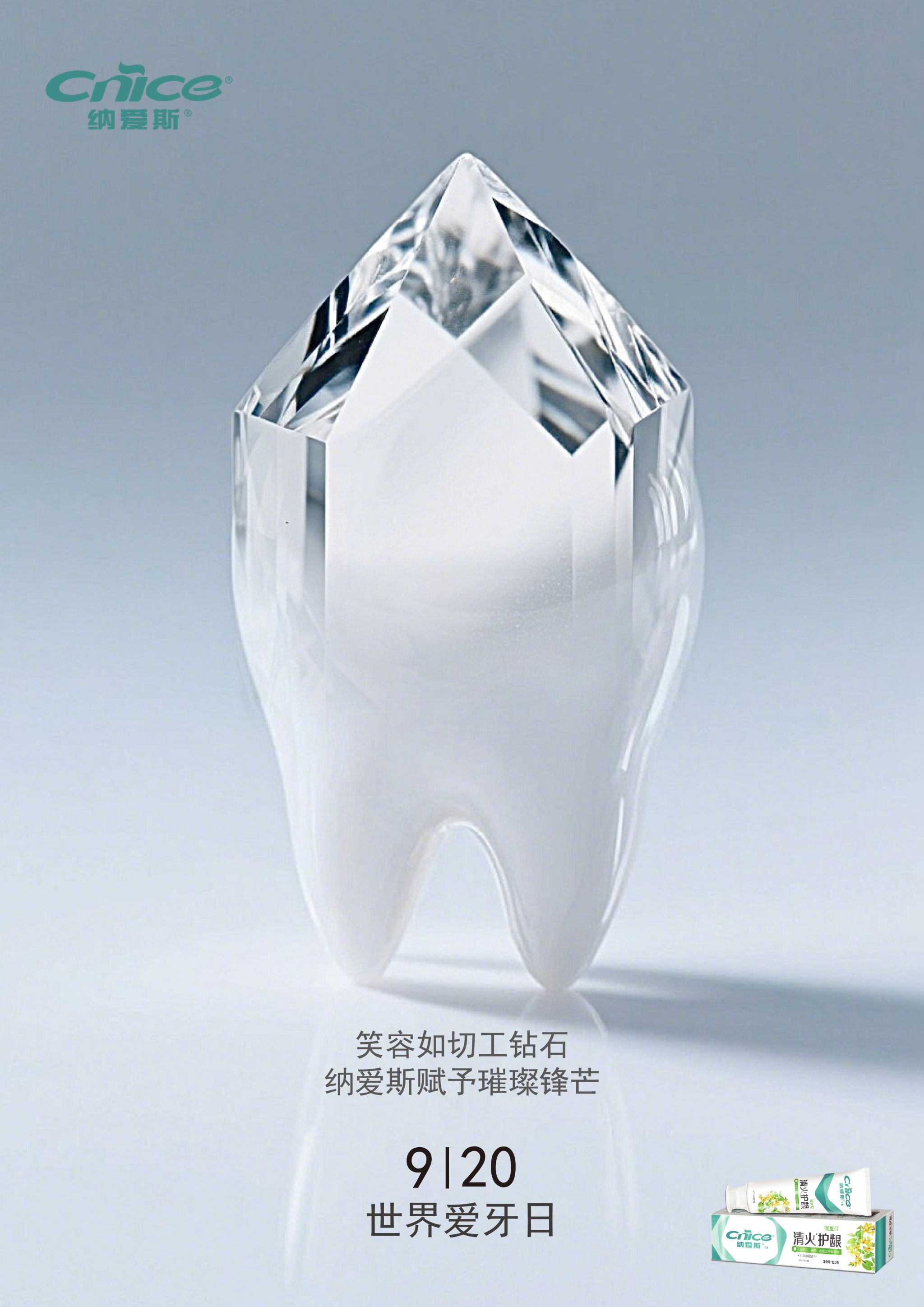 这是一个为纳爱斯为题的广告海报设计,以爱牙日为主体,运用了联想的创意手法,一为定窑以白瓷为主要产品釉色纯白滋润,釉面多为乳白色色,给人以柔和悦目、温润恬靜之美感。其二是钻石,是唯一种集最高硬度、强折射率和高色散于一体的宝石品种,表示使用了纳爱斯牙膏,牙齿得以洁白、明亮、闪烁。猛犸象牙是有机宝石的一种其自身含有量的微量元素,长期将猛犸象牙佩戴在身上,可以对人体起到美白皮肤的功效和作用寓意使用纳爱斯牙膏有相同牙齿美白作用。