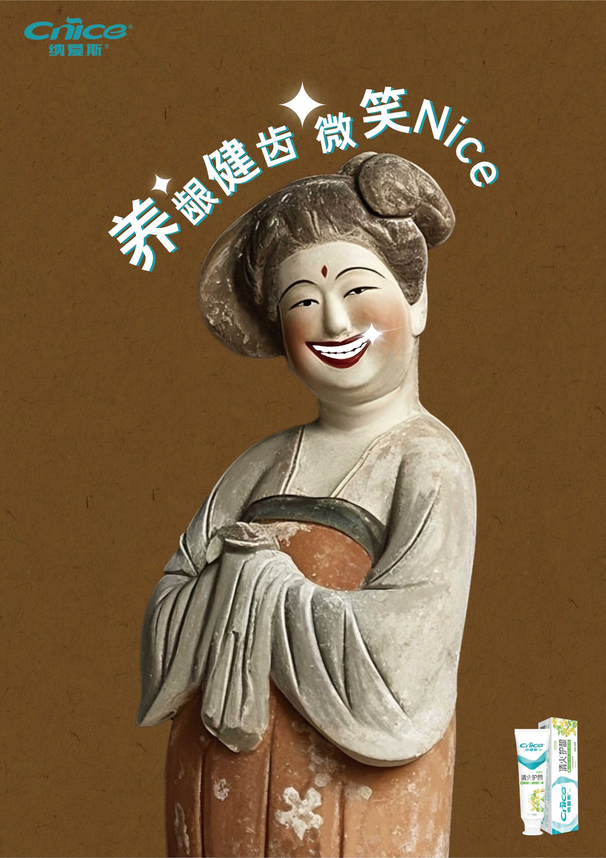 以"文物是凝固的历史,微笑是流动的文明"为创作原点,通过将汉代陶俑、北齐思维菩萨、唐三彩女俑等文物IP进行"微笑改造"——在保留文物特征的基础上,赋予其健康牙齿的灿烂笑容,形成历史与现代的时空对话。