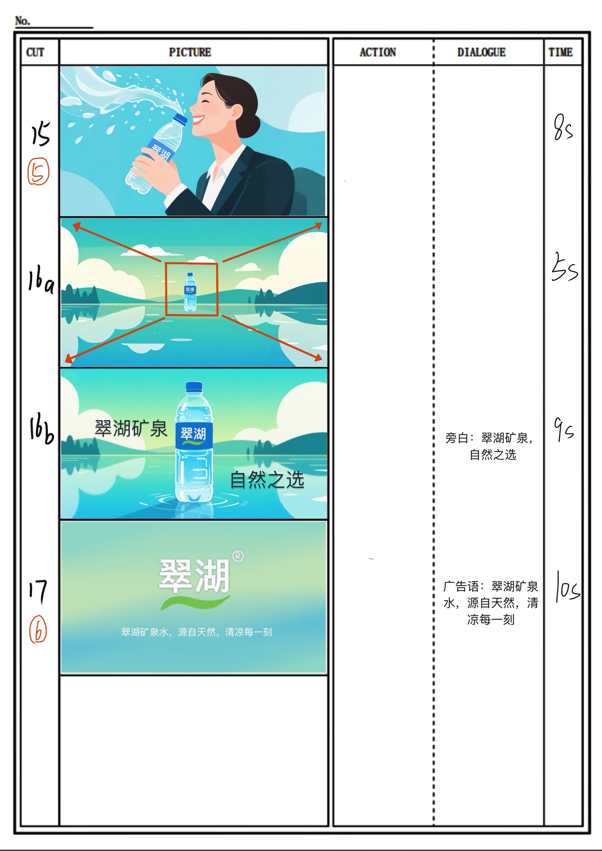 广告分镜以 “源自天然,传递清凉美好” 为核心,采用感性诉求策略,借类似、对比、因果联想构建创意。开篇以炎热街头人们的烦躁,与送水小哥身着翠湖工服送水的场景形成对比,凸显产品出场的必要性。送水途中,矿泉水如 “精灵” 般带来系列神奇变化:让将融化的咖啡店招牌 “降温”、为篮球少年注入活力、使枯萎花朵重焕生机,还融入情侣拍照场景,通过因果联想,展现产品为不同场景带来的清凉与美好。结尾以白领称赞产品品质与配送,及瓶身放大后呈现的翠绿湖水、蓝天白云画面,强化 “源自天然” 属性,传递品牌值得信赖的形象,呼应 “翠湖矿泉水,源自天然,清凉每一刻”的广告语。