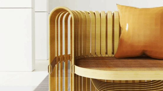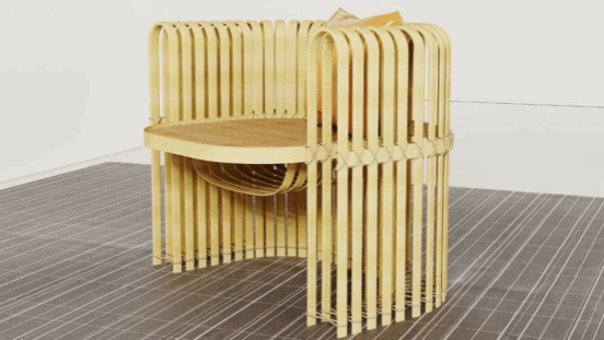 该设计可分为为单人椅和抱枕两部分,单人椅采用生长迅速的竹子和易于获取的天然大麻纤维手工制作,既环保又可快速再生。运用简单的热压弯曲工艺,将竹子塑形为温暖的半包围式曲线,旨在为用户带来既赏心悦目的视觉享受以及舒适惬意的坐感体验。与之相配的抱枕则选用生物基皮革面料与丝瓜瓤材料,生物基面料是通过多次实验制作对比后选取最适合加工的一版,其具有同皮革一般的韧性和柔软性,可在自然环境下进行快速降解。