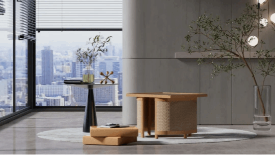创作灵感来源于湖南湘西地区多用自然取材来制作家具和房屋,这些木制家具不仅美观且区别于普通的棉纺家具,最大程度地保留着木头原本的质感以及纹理,再辅以编织等民俗手工艺技法,制成朴素但又不失特别的家具。如今的可持续与绿色发展得到世界以及政府的支持,寻求新兴的可回收利用材料去制作家具可以保留当地的民俗家具特色,也可以为绿色发展事业贡献一份力量,也可以使可回收材料应用到生活中去。
