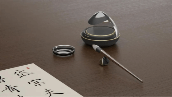 “云沫”是专门为书法爱好者设计的系列智能书法用品,云沫书法套装的设计从书法爱好者的痛点出发,并增添用户使用过程中的乐趣。在墨碟设计中,采用了保湿措施来保存墨水,让书写过程更加持久。毛笔设计为可更换笔头,通过螺旋结构适应不同书体需求,同时节省收纳空间。笔搁采用勒洛四面体形态,结合无意识设计,使其变为把玩的物件;配合香插,让书法带给用户的宁静最大化。