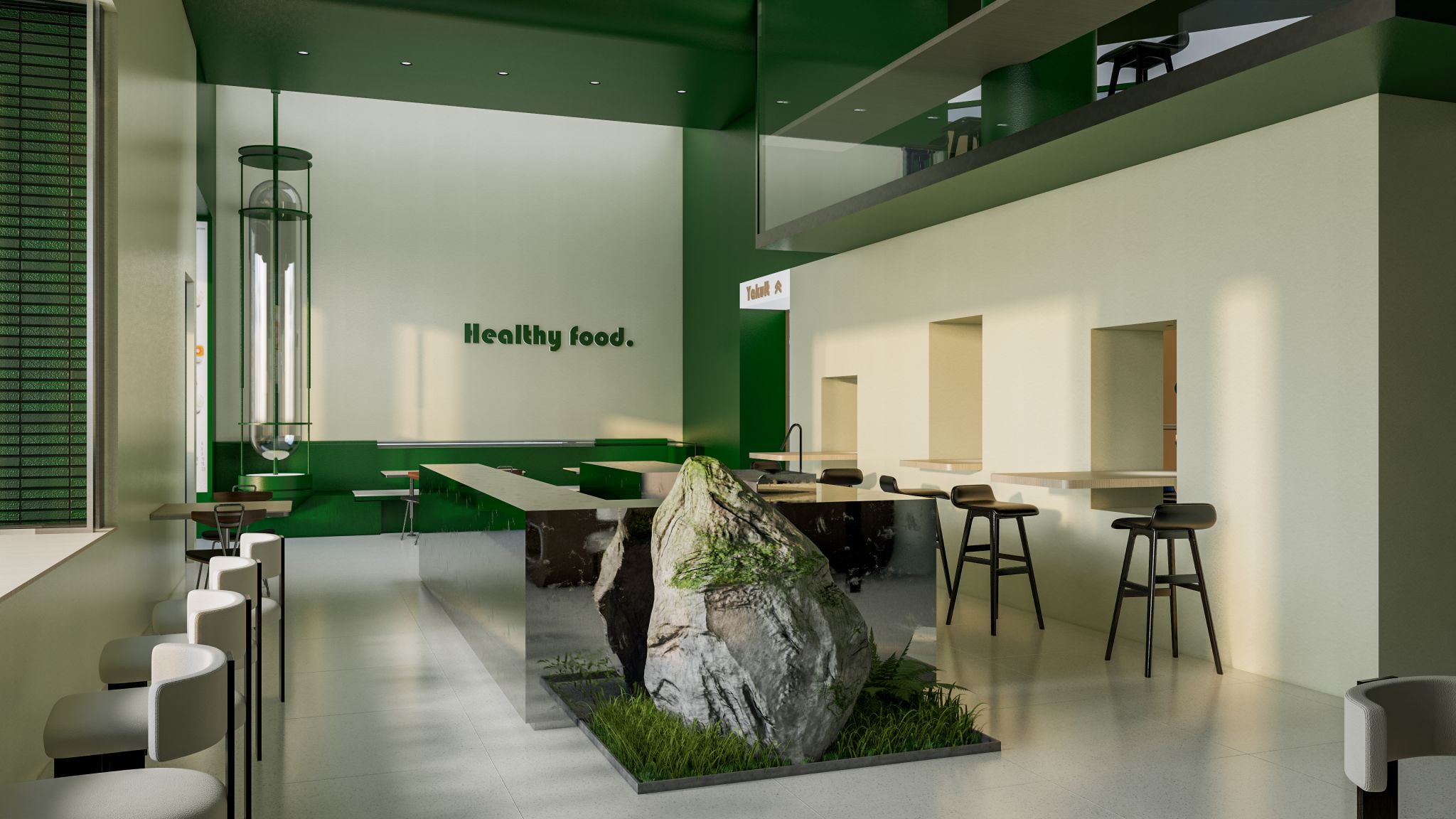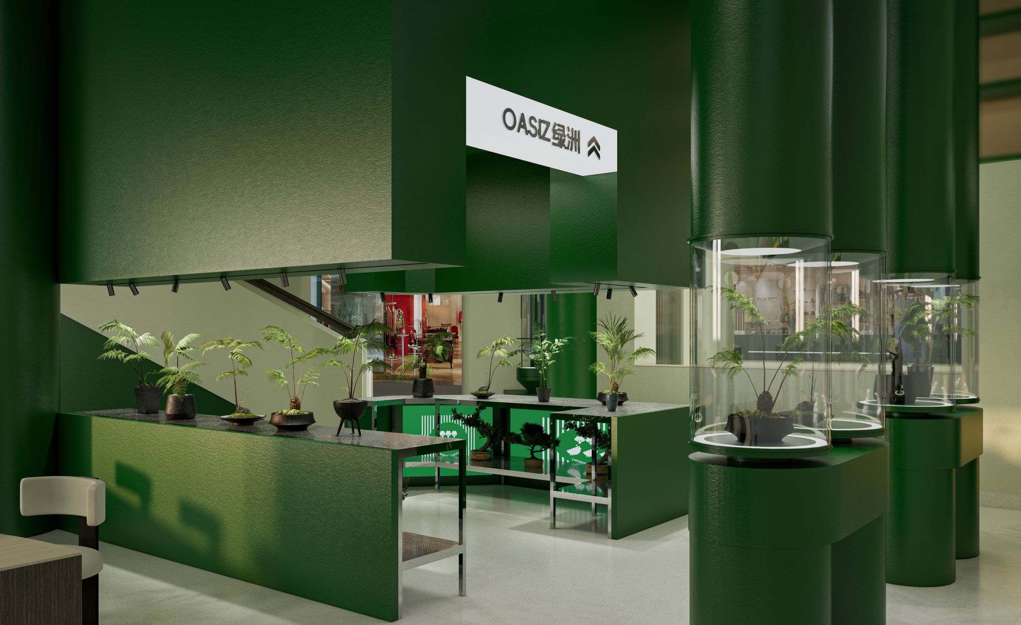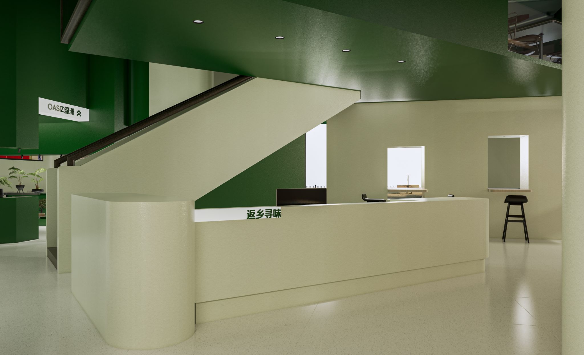 主题名为“返乡寻味”。中式快餐代表品牌“老乡鸡”,专注食材的源头,为中式快餐开创了“从土地到餐桌”的全产业链标准。在本次设计中作为老乡鸡品牌一次全新的探索与尝试,通过此次的养乐多品牌与OASIZ绿洲品牌的联名升级,从营业内容到体验环境多元化的维度,打造一个符合年轻都市白领休闲消费的全新用餐体验模式。让整个体验从单一的餐饮空间到具有休闲属性的公共空间转变,这种转变不仅是营业内容的改变,更体现在空间设计上的变化。
