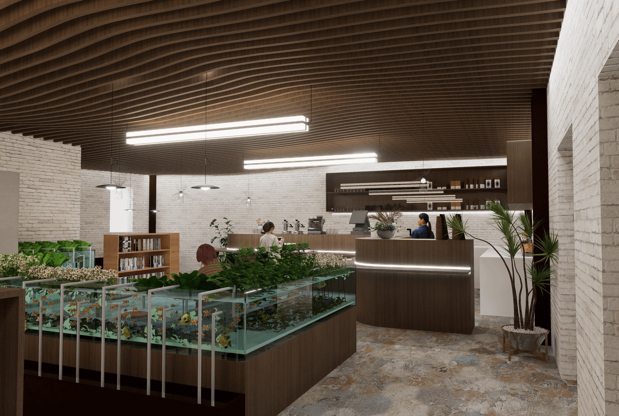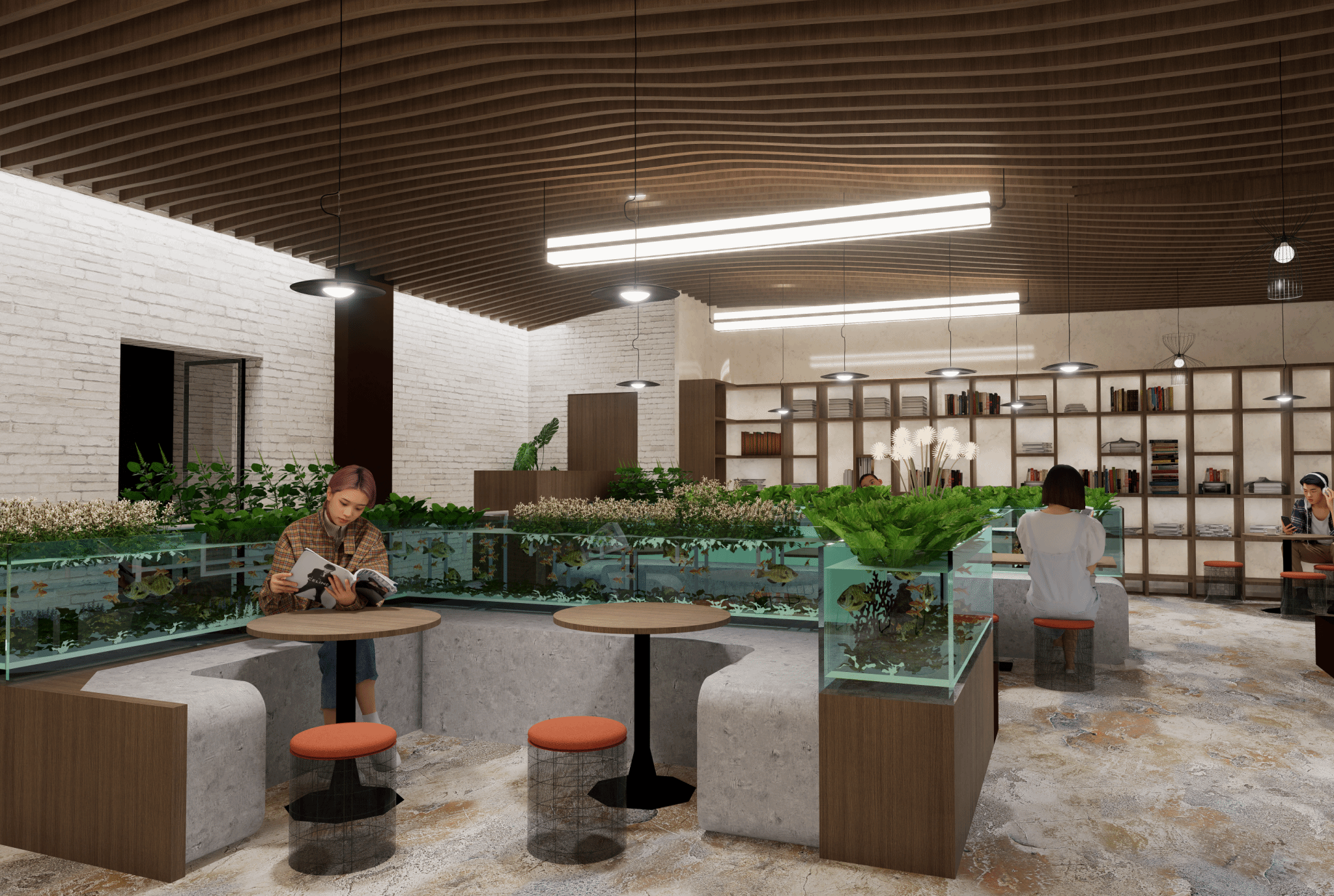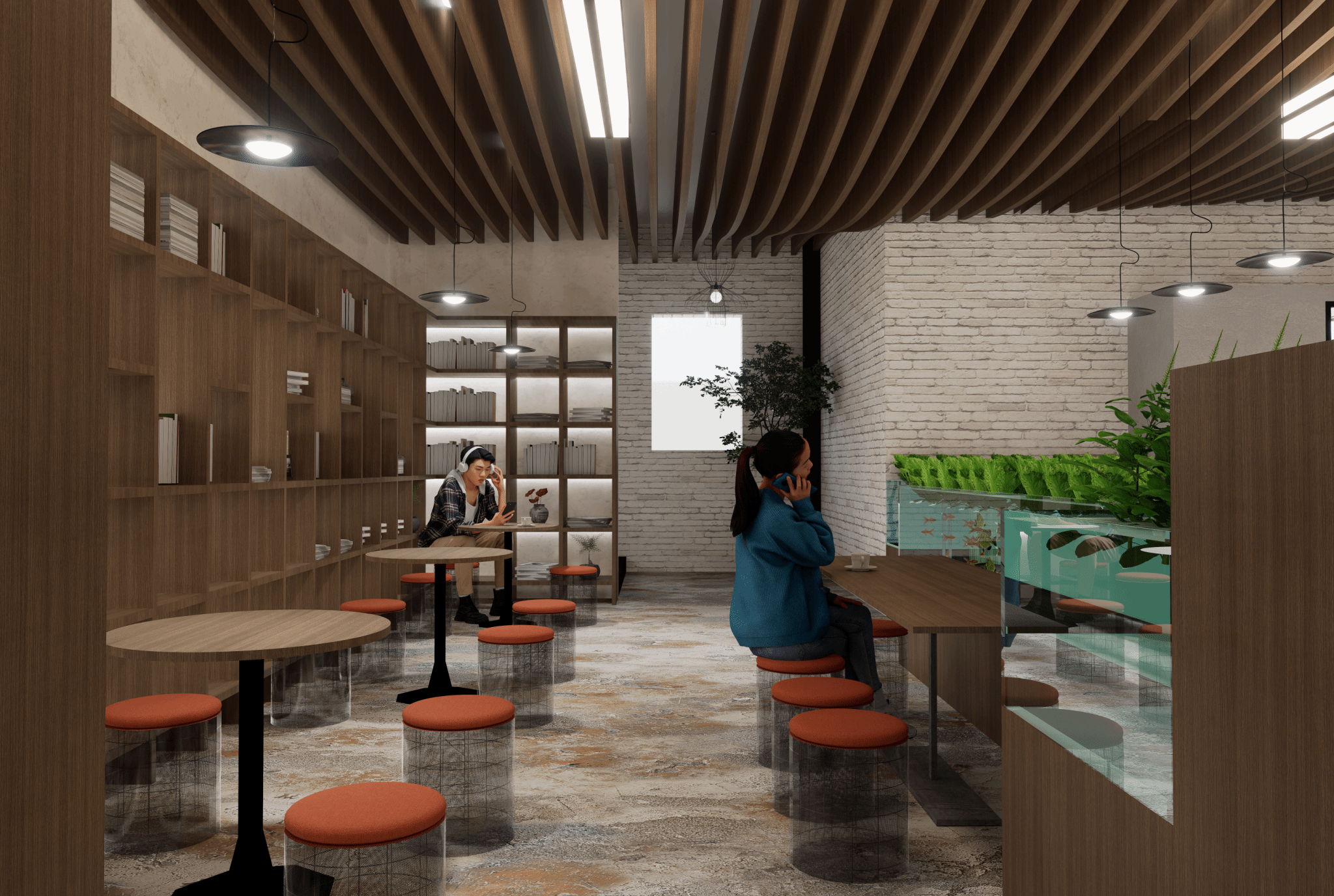 本次设计《简知书咖》咖啡书吧商业空间,该店选址位于广州市永庆坊旅游区,空间设计以1200书吧为品牌,结合咖啡馆的休闲氛围与图书馆的文化属性,探讨咖啡书吧中的应用及其对顾客体验的影响。室内空间功能布局内部空间分为开放式餐饮区和封闭式的包间,中央设有吧台;在空间功能上不局限于售卖,增加鱼菜共生系统使消费者可以通过书吧了解科学知识文化;在内部空间设计上运用情景故事线带入,运用柯布西耶建筑五要素中的底层透空,以达到生态循环状态,使整个空间更为灵活让人们享受大自然的这一刻。装饰风格简约现代风,营造自然、健康的氛围,门头简洁的设计,空间采用天然材质如木头、石头等,融合植物设计,体现健康绿色的形象。外立面让顾客可以看到店内的环境,增加透明感。呈现具有岭南文化风情的咖啡书吧商业空间,在推广1200品牌同时传播广州传统文化,鱼菜共生的理念所在。