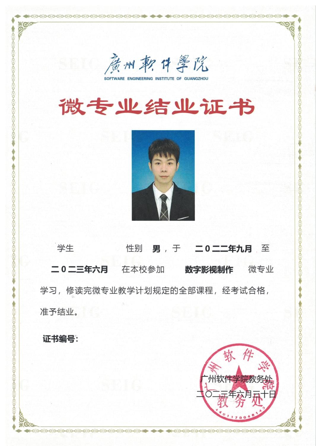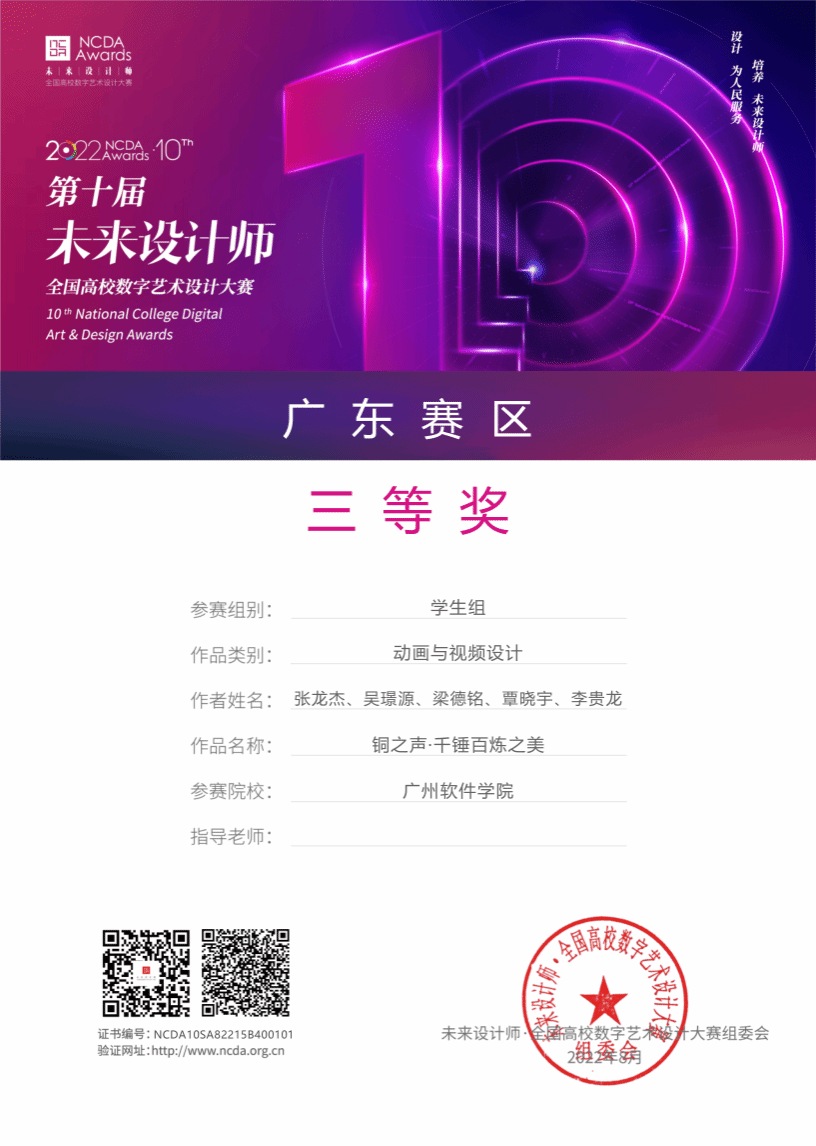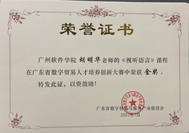 2022届数字影视制作微专业学生张龙杰等人的作品《铜之声·千锤百炼之美》获第十届未来设计师全国高校数字艺术设计大赛三等奖、首届“中华文化传承传播”主题视频大赛微纪录片三等奖、广州软件学院游戏文化节第七届新媒体创意大赛一等奖。