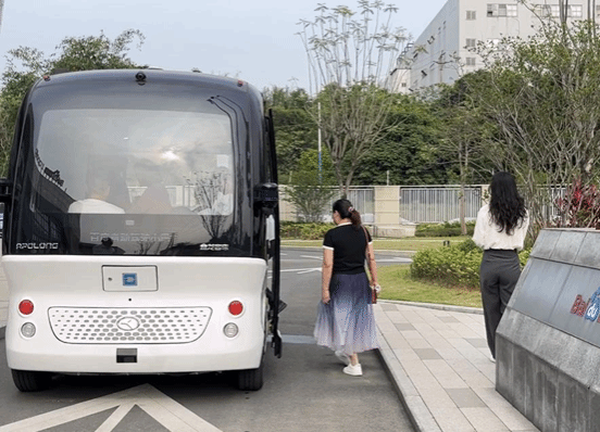 老师、同学们分批次乘坐无人驾驶小巴进行体验