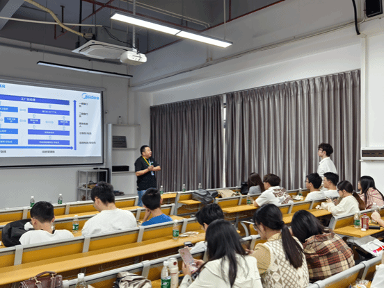 另一场平行会议是美的集团岗位发展交流会,由美的生活电器事业部营运主管方经理主持。他分享了美的企业文化和价值观,指出创新、合作与责任感的重要性,并详细讲解了美的从创业初期到全球领域多元化产业布局的发展历程,以及“1+3+N”的业务结构和美的生活事业部的组织架构。方经理强调,美的集团是一个提升专业能力的理想平台,相信同学们加入美的都能学有所获。会上,学生们积极参与讨论,表达了对企业文化的理解与认同,加深了对美的品牌的认知,也为他们未来的职业目标设定、职业发展路径提供了宝贵的实践经验和灵感。