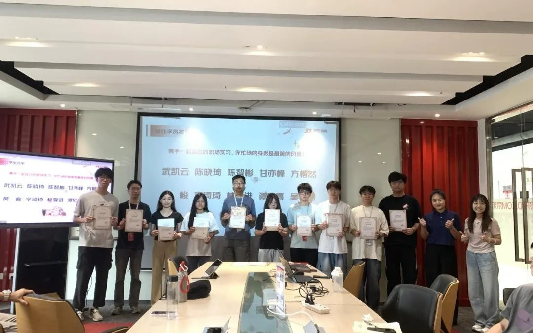 随后举行的证书颁发仪式将活动推向高潮。京东企业代表赵沅君女士与校方京苗班辅导员王舒雯老师共同为31名顺利完成实训任务的学员颁发了京东实习结业证书,为这段充实的企业实践画上圆满句号。