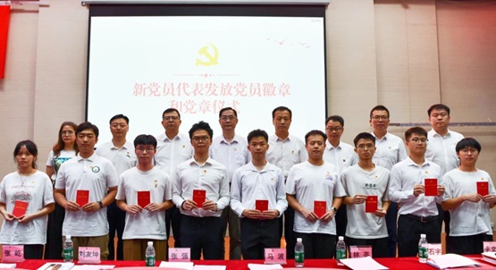 会议现场举行了2024年新党员入党宣誓仪式,老党员重温入党誓词,与会人员全体起立面向鲜红的党旗,举起右拳许下铮铮誓言。随即,校领导、党委委员为新发展的党员代表颁发《中国共产党章程》,并佩戴党员徽章。
