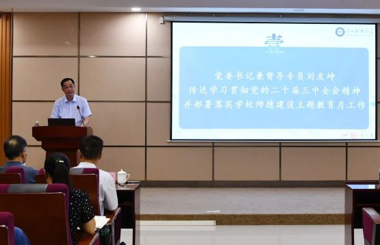 会上,刘友坤书记传达学习贯彻党的二十届三中全会精神,并部署学校师德建设月有关工作。“作为新时代高校教育工作者,学习好贯彻好党的二十届三中全会精神,是当前和今后一个时期的一项重要政治任务。”刘友坤就学校学习贯彻落实党的二十届三中全会精神提出三点要求,一是要深入学习领会党的二十届三中全会的重大意义。全会作出的重大部署、取得的重要成果,事关党和国家事业前进方向,事关改革开放和现代化建设全局,对于激励全党全军全国各族人民团结奋斗、锐意进取,以中国式现代化全面推进强国建设、民族复兴伟业具有重大而深远的意义。二是要全面准确学习把握党的二十届三中全会精神实质和核心要义。唯有将历史与未来、理论与实践、国内与国际的维度紧密结合,从全局视角出发,由整体到局部,再由局部到整体,深入学习,全面把握,方能避免片面理解,确保知其然更知其所以然。三要深入推进党的二十届三中全会精神在我校的贯彻落实。全校党员干部和师生员工要以高度的政治自觉、昂扬的精神风貌和严谨的学习态度,积极开展党的二十届三中全会精神的学习宣传贯彻工作。全校各单位和各级党组织要结合全会关于教育改革的重大部署,聚焦广东省教育强省建设“八大工程”,结合学校实际,统筹推进育人方式、人才培养、管理体制等体制机制改革,为学校实现高质量发展注入强大动力。