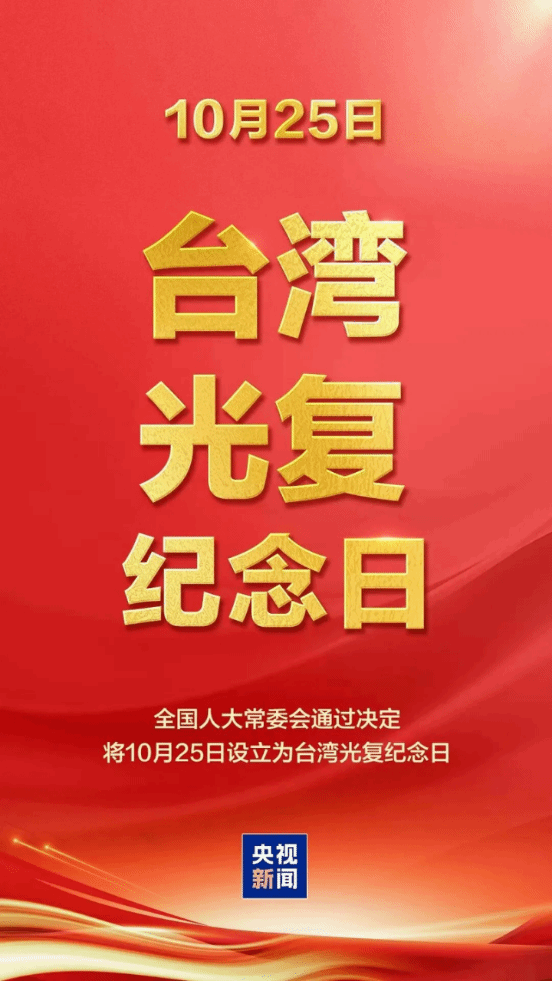 资料:2025年10月24日,十四届全国人大常委会第十八次会议表决通过将每年10月25日设立为台湾光复纪念日。