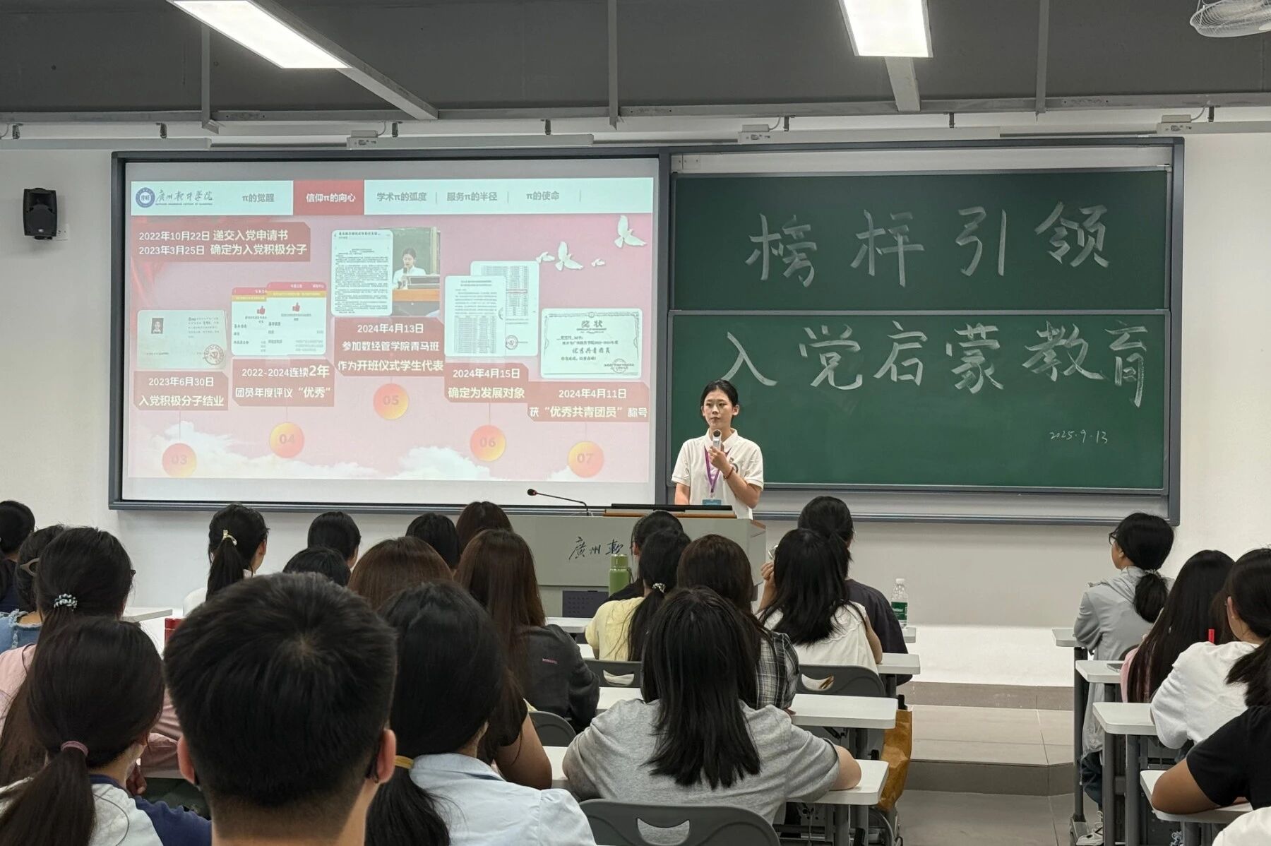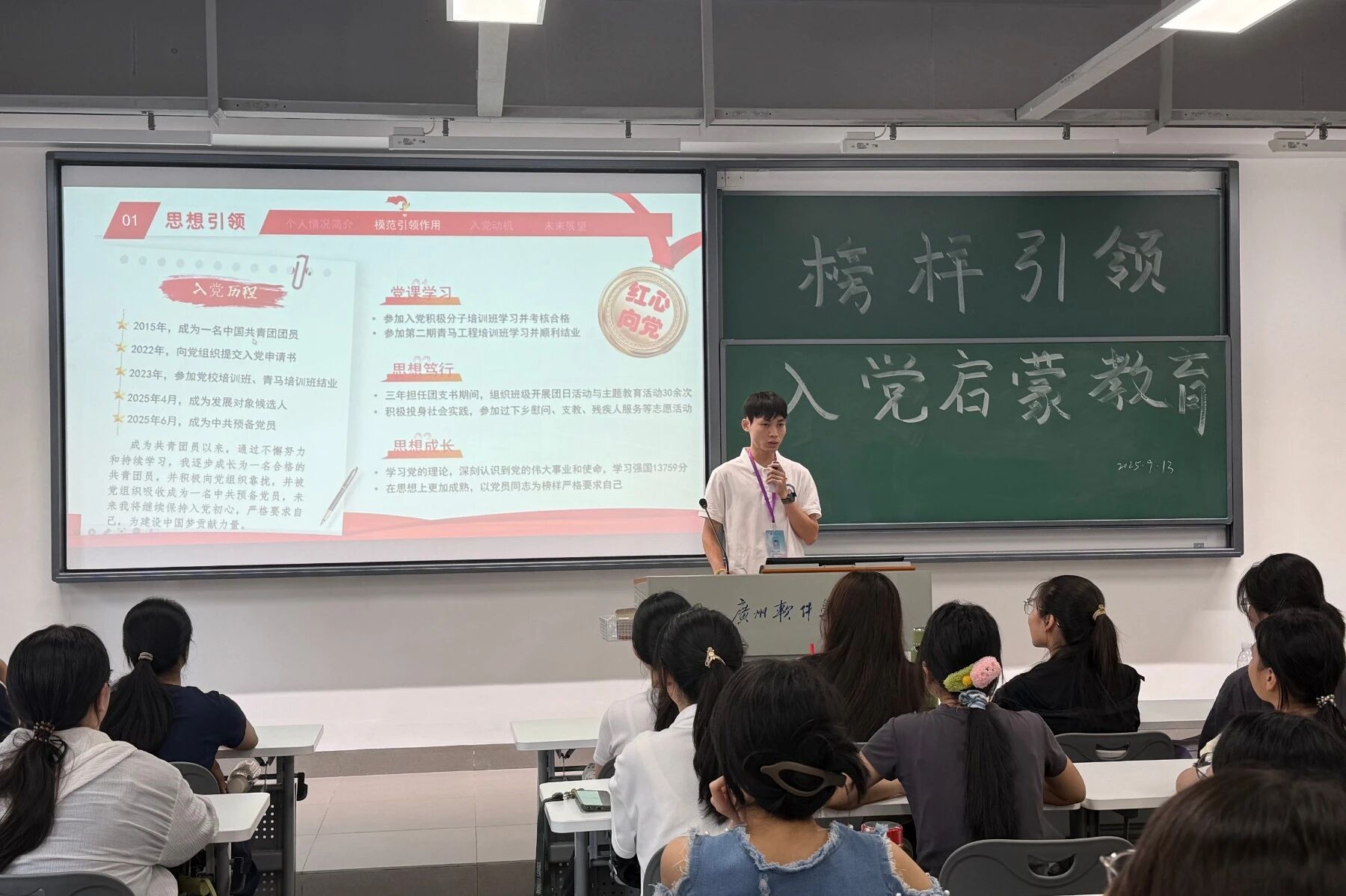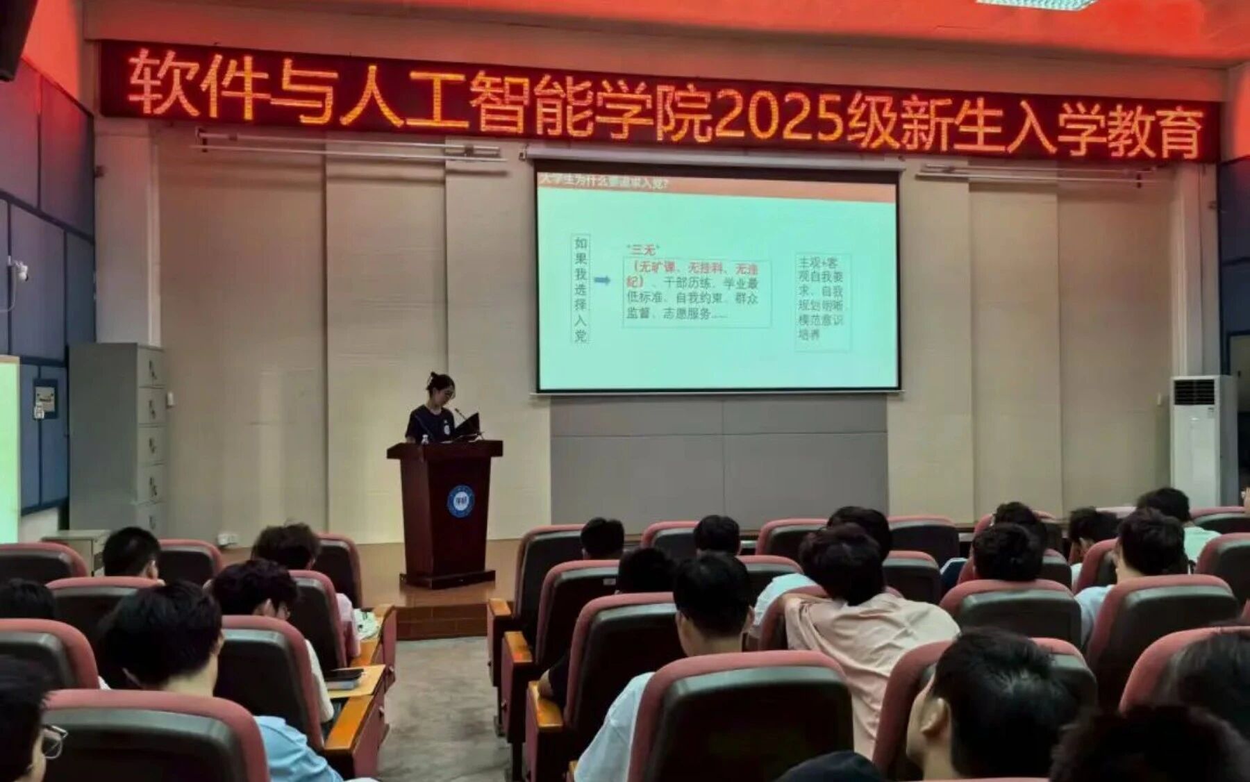 2025级本科2025年9月15日,软件与人工智能学院为2025级本科新生举办入党启蒙教育讲座,由学生党支部雷蕾同学主讲。她首先阐述了党的性质、宗旨和光辉历史,带领同学们更加深入地了解中国共产党。随后,她围绕“为什么入党”这一核心问题,与新生探讨了正确的入党动机与初心使命,并详细解读了申请入党的具体条件与发展流程。最后,学生第二党支部书记谭斯韵老师对本次启蒙教育进行总结,勉励同学们坚定理想信念,在日常生活和学习中不断提升思想觉悟,积极追求进步,以实际行动向党组织靠拢,争取早日成为一名光荣的中国共产党党员,为党和人民的事业贡献自己的力量。