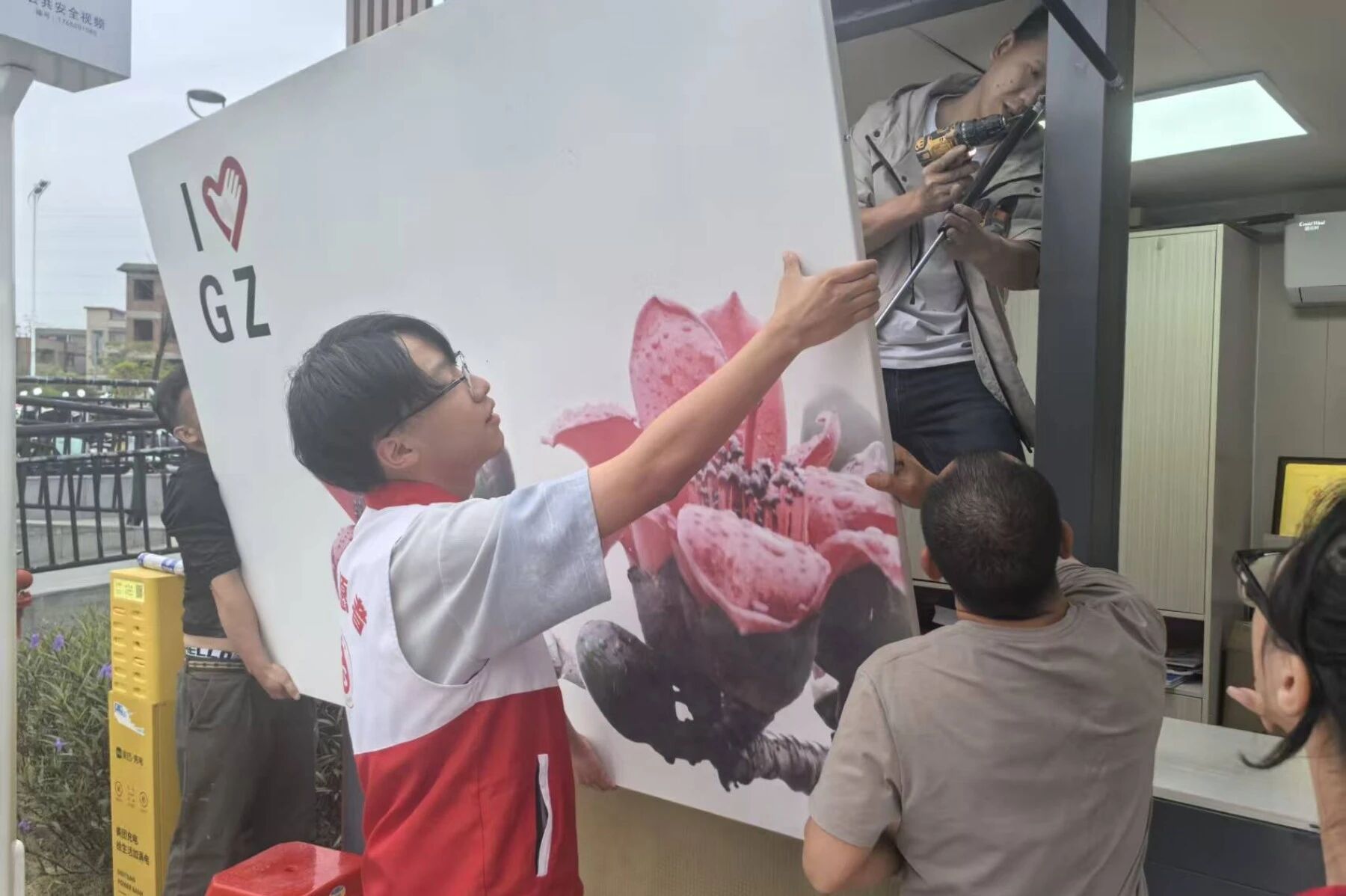 入党积极分子协助工人师傅安装驿站窗户