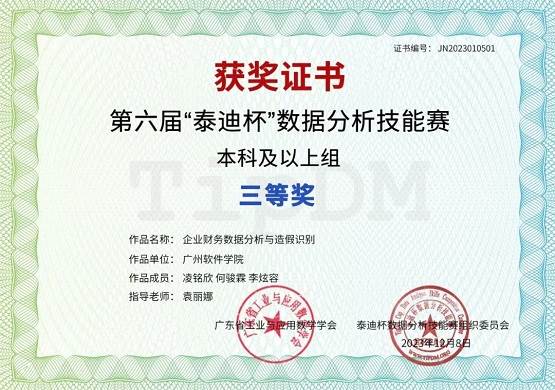 (9)2023年指导学生荣获“泰迪杯”数据分析技能赛本科及以上组三等奖。