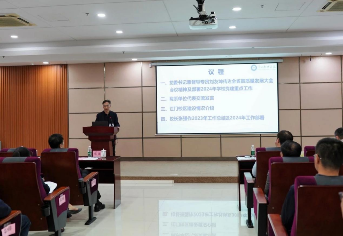 会上,刘友坤传达了广东省委书记黄坤明在2024年广东省高质量发展大会上的讲话精神和广东省教育厅厅长朱孔军关于“扎实推进教育强省建设,以高质量教育支撑高质量发展”的讲话精神。刘友坤表示,广东省委书记黄坤明在大会上的讲话,为广东省的高质量发展指明了方向。我校师生要深入学习会议精神,持续深化高等人才培养教育改革,以产教融合、科教融汇为主要抓手,持续为广东省以及粤港澳大湾区培养高素质应用型人才。