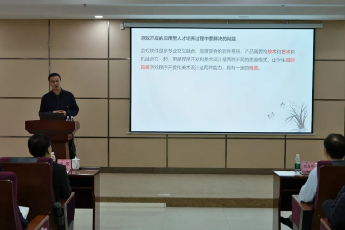 游戏系主任罗林以“专业融合、校企协同,实践游戏开发的应用型人才培养”为题,围绕该系在人才培养过程中面临的困境,解决问题的办法,以及探索专业融合、校企协同育人的成效,并对接下来如何进一步推动该项工作的落地落实等作汇报交流。
