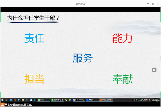 接着,在为什么担任学生干部的问题上,蔡锶琪同学认为担任学生干部要先摆正自己的心态。担任学生干部不应该只是为综测、平时成绩和增加自己获得奖学金的机会而做。应在担任学生干部中学习知识、学习技能,提升自己的交际能力与处事应变能力。最后他把学生干部总结为能力、责任、担当、奉献与服务。