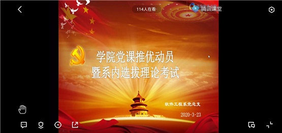 本网讯 为了加强入党积极分子的政治理论知识水平,选拔政治素养高、理论扎实的入党积极分子参加党校培训,扩大党支部的后备力量,2020年3月24日14:00,软件系学生党支部于腾讯课堂平台举行党校推优动员大会及入党积极分子理论考试,共有101名入党积极分子参加本次考试。动员大会及线上考试由宋安娜老师主持。