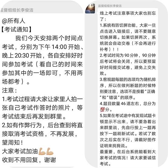 由于受疫情的影响,考核采用的是线上考试,本次参考者共有99人,为了避免个别人员在时间上有所不便,党支部安排了14:00和20:30两个考试时间段。而在考试前,工作人员也在相关通知群就考试纪律以及线上考试注意事项进行了详细说明。