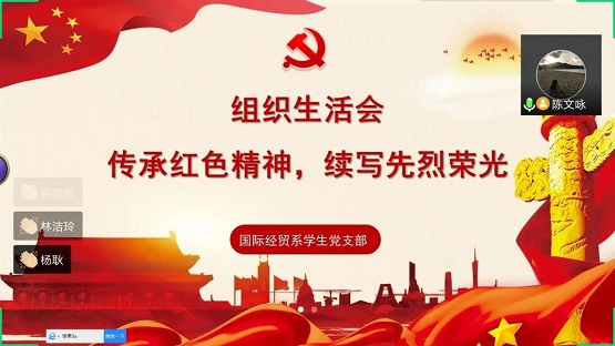 本网讯 清明已过,但缅怀先烈之情依旧持续。为引导师生在缅怀先烈的情怀中增进爱党爱国的真挚情感,汇聚打赢疫情防控阻击战的蓬勃力量,国贸系学生党支部以“传承红色精神,续写先烈荣光”为主题,于2020年4月7日14:30召开线上组织生活会,国贸系学生党支部吴卓君书记以及支部全体党员同志参与了本次会议,会议由巫芳艳同志主持。