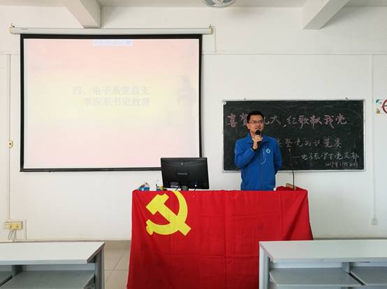 本网讯 11月2日下午14:00,电子系学生党支部于U404举行“喜贺十九大,红歌献我党” 歌咏比赛暨新党章知识竞赛,旨在祝贺十九大召开,为党献歌,初心不移。出席此次会议的有电子系党总支李应东书记、学生党支部周洁银书记、各位学生党员和入党积极分子。