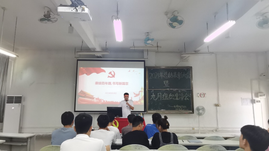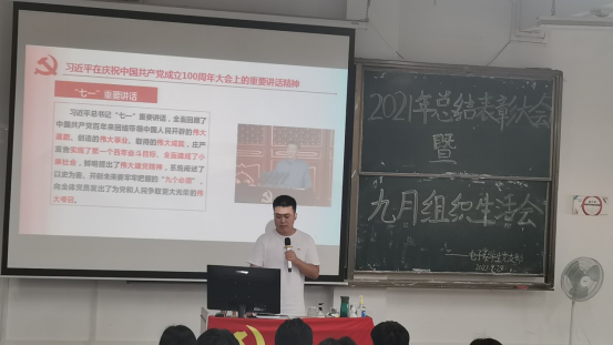 本网讯 为深入领会习近平总书记“七一”重要讲话,深入学习《中国共产党普通高等学校基层组织工作条例》。电子系学生党支部于2021年9月28日13:00在D101召开以“赓续百年路,书写新篇章”为主题的组织生活会。莅临本次会议的嘉宾有电子系学生党支部书记周洁银老师以及各位党员同志。