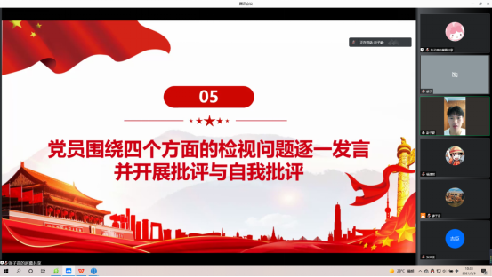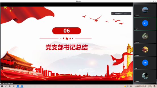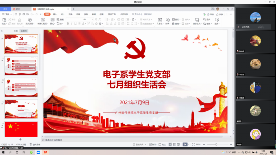 本网讯 为深入学习贯彻习近平总书记在庆祝中国共产党成立100周年大会上的重要讲话精神,引导党员坚定理想信念,发挥先锋模范作用。电子系学生党支部于2021年7月9日10:00通过“腾讯会议”平台召开七月组织生活会。出席本次会议的嘉宾有电子系学生党支部书记周洁银老师、电子系学生党支部副书记彭子豪同志以及各位学生党员同志。