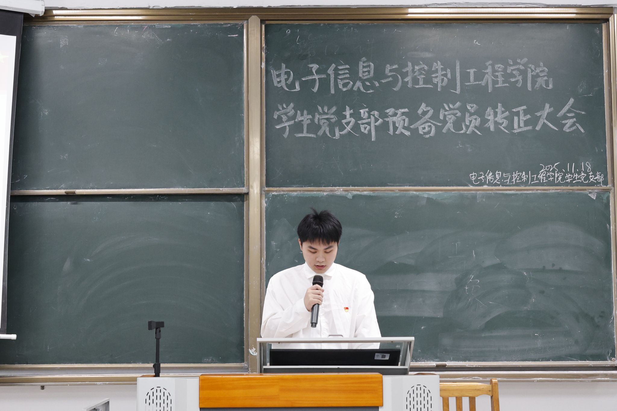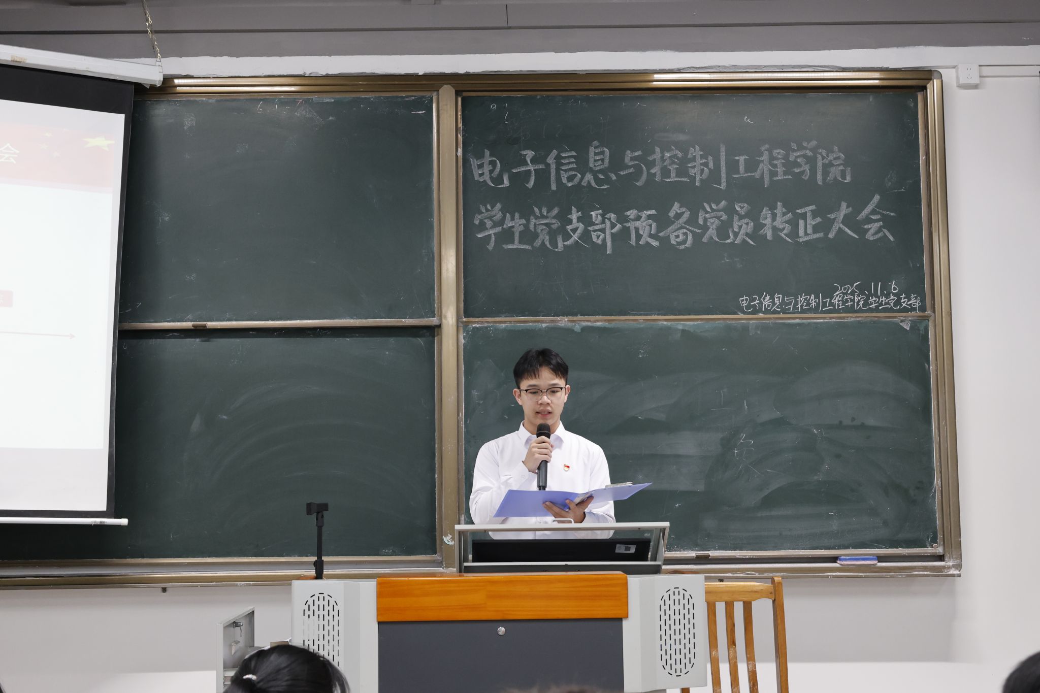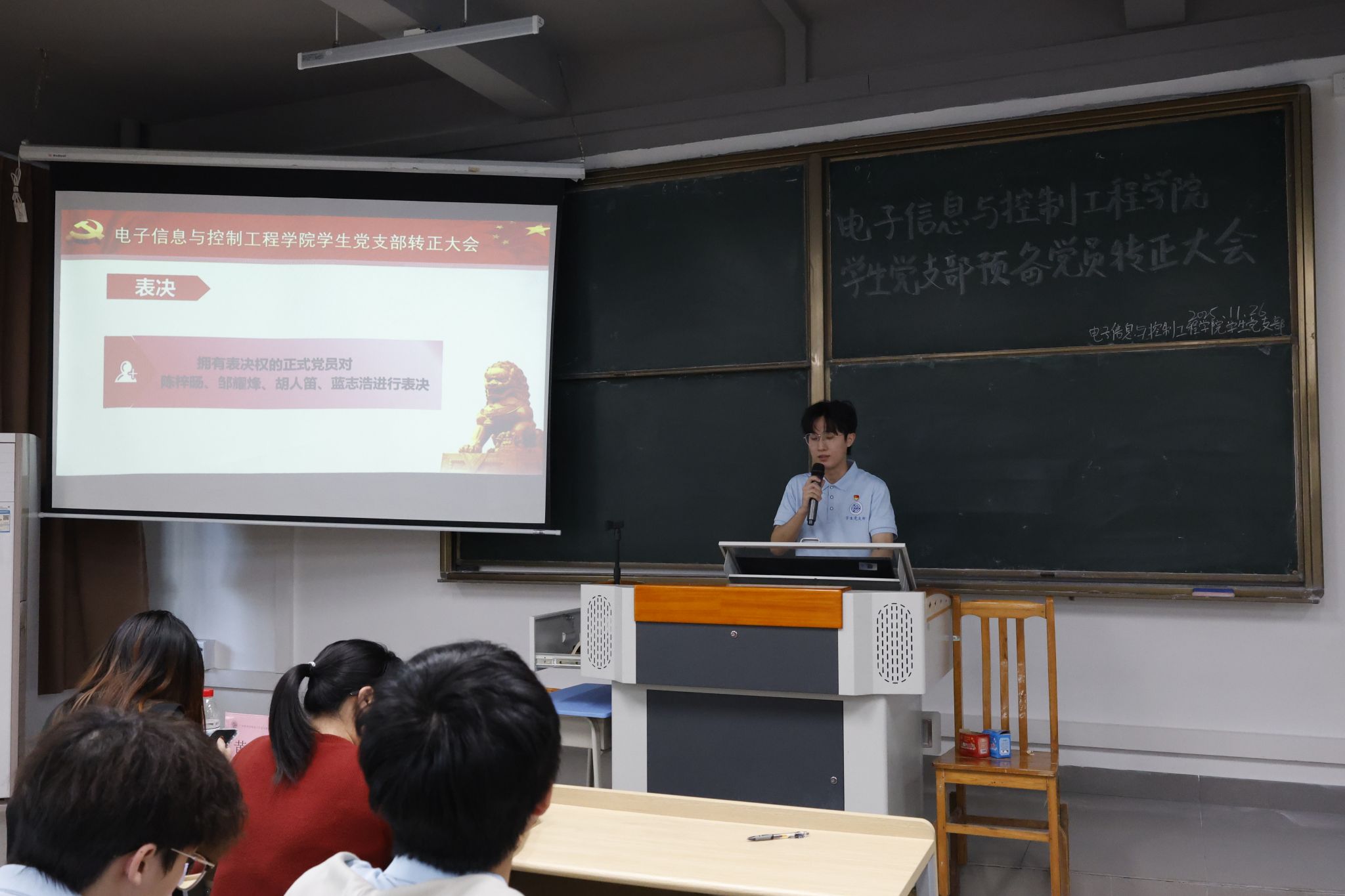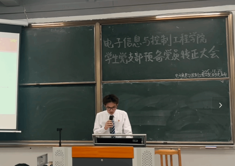 各次会议伊始,全体起立奏唱国歌。唱毕,主持人林旭彬介绍预备党员转正的投票办法及相关事宜,明确了表决流程、计票与监票人员职责等。陈梓旸、邹耀烽、胡人笛、蓝志浩四名预备党员分批次上台宣读转正申请书,汇报预备期的培养考察过程,总结自身学习与思想情况,说明这段时间的收获,并反思存在的缺点。