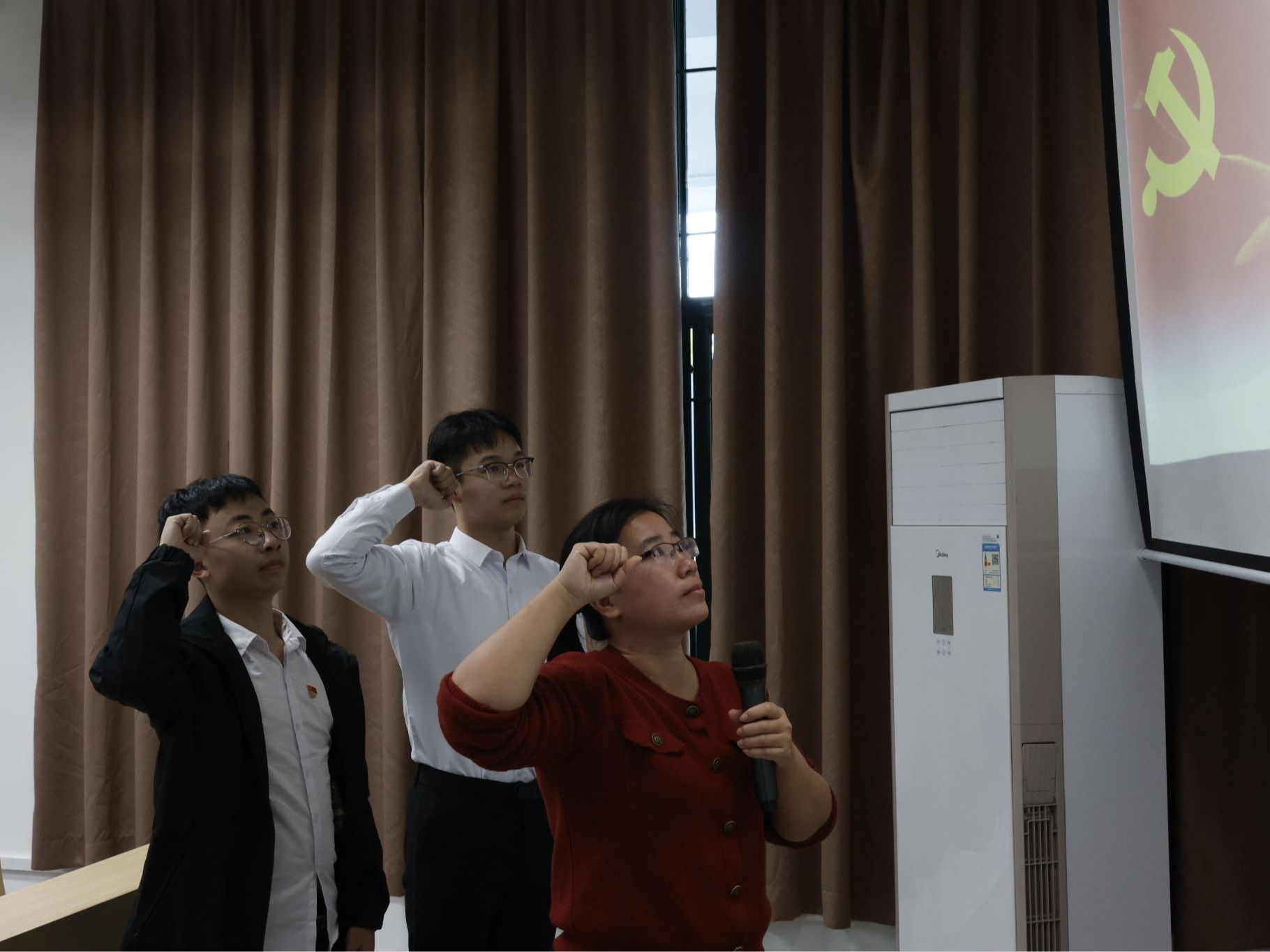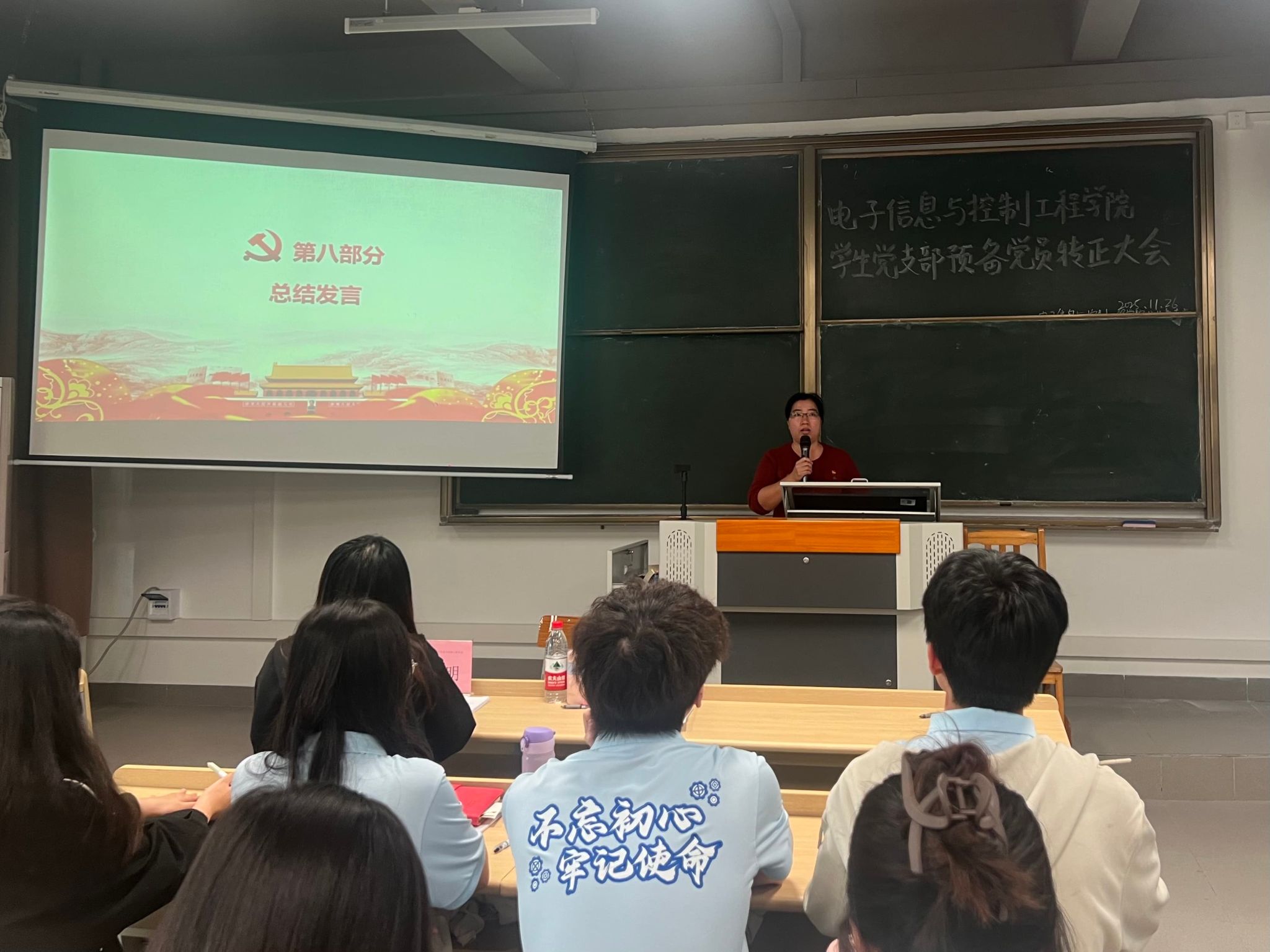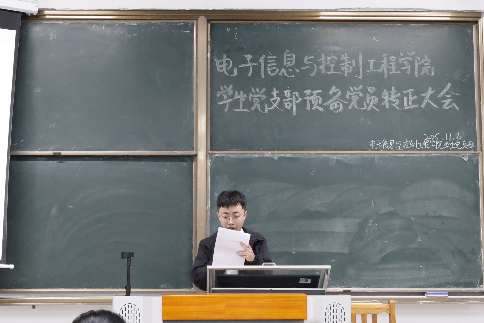 各次会议伊始,全体起立奏唱国歌。唱毕,主持人林旭彬介绍预备党员转正的投票办法及相关事宜,明确了表决流程、计票与监票人员职责等。陈梓旸、邹耀烽、胡人笛、蓝志浩四名预备党员分批次上台宣读转正申请书,汇报预备期的培养考察过程,总结自身学习与思想情况,说明这段时间的收获,并反思存在的缺点。