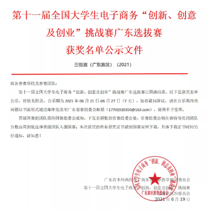 “三创赛”由国家教育部主管、全国电子商务创新产教联盟主办,是激发大学生兴趣与潜能,培养大学生创新意识、创意思维、创业能力以及团队协同实战精神的学科性竞赛。广软历来重视学生创新创业能力的培养,积极通过学科竞赛来增强学生的创新创业意识、专业应用能力。本次“三创赛”充分展示了广软师生良好的精神风貌和专业素养,同时对学院以赛促学、以赛促教,不断提升专业办学水平起到积极促进作用。
