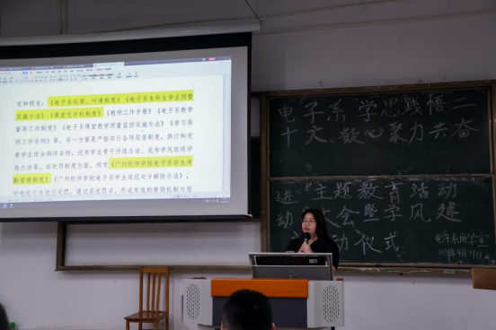 在会议中,曾慧琳老师为同学们讲解了学风建设的具体方案。她深入解读了学校将通过制定和颁布《课堂无手机》《广州软件学院电子系考勤管理制度》等,来规范同学们的学风和纪律。曾慧琳老师还强调了学校对学风建设的重视和支持,希望同学们能积极配合学校的管理措施,共同营造良好的学习氛围,为个人和集体的发展贡献力量。通过曾慧琳老师的讲解,班干们对学风建设的重要性有了更深刻的认识。