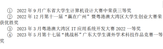 获得第九届中国国际“互联网+“大学生创新创业大赛省级银奖;第十七届“挑战杯”广东大学生课外学术科技作品决赛一等奖;第八届粤港澳大湾区IT应用大赛总决赛一等奖;第十一届“赢在广州”创业大赛优胜奖;第四届广东省大学生创新创业邀请赛省赛金奖等奖项。