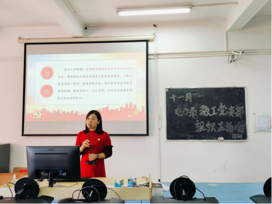 为深入学习贯彻习近平总书记关于教育的重要论述。我系教工党支部于11月21日下午13:40在S403召开了11月组织生活会,首先,教工党支部书记李芳老师带领大家学习,学习习近平新时代中国特色社会主义思想蕴含的发展观,提出大家要科学把握发展大势、满足人民群众新期待的现实要求;立足当前、着眼长远的理论体系;强国建设、民族复兴的行动指南;要为共享繁荣的美好未来贡献中国方案,开拓人类文明发展的新格局,深化了对人类文明发展规律的认识,为推动构建人类命运共同体作出积极贡献。