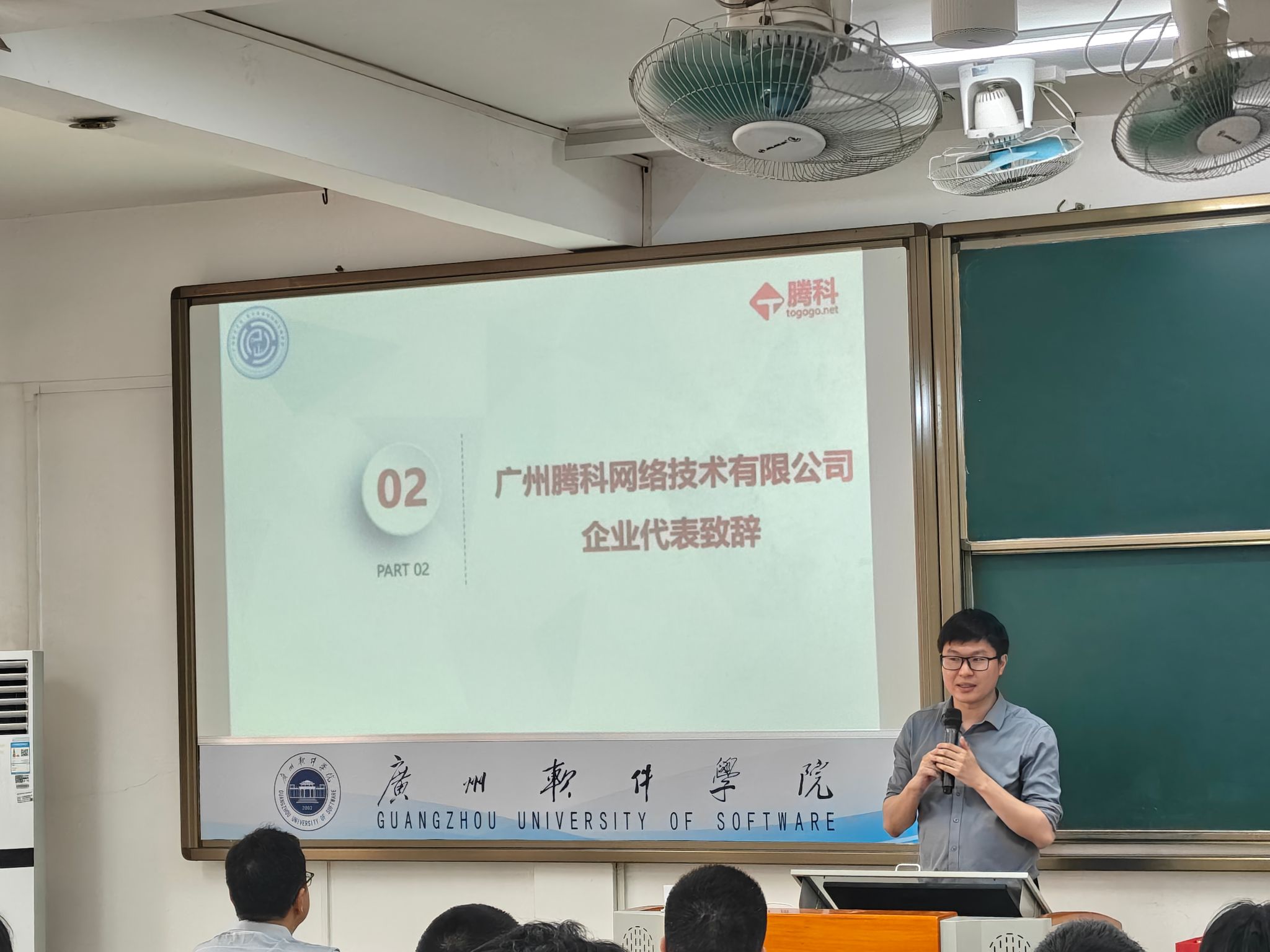 广州腾科网络技术有限公司袁泽帆经理作为企业代表致辞,强调人工智能(AI)技术正深刻改变生活、学习,是未来职场核心竞争力,掌握AI即把握时代机遇。他表示,作为学院长期合作伙伴,腾科将全力提供师资、资源与实战支持。袁经理寄语学员,希望与大家交流技术、共同进步,并祝愿学员学有所成,考取华为认证,迈向技术专家目标。
