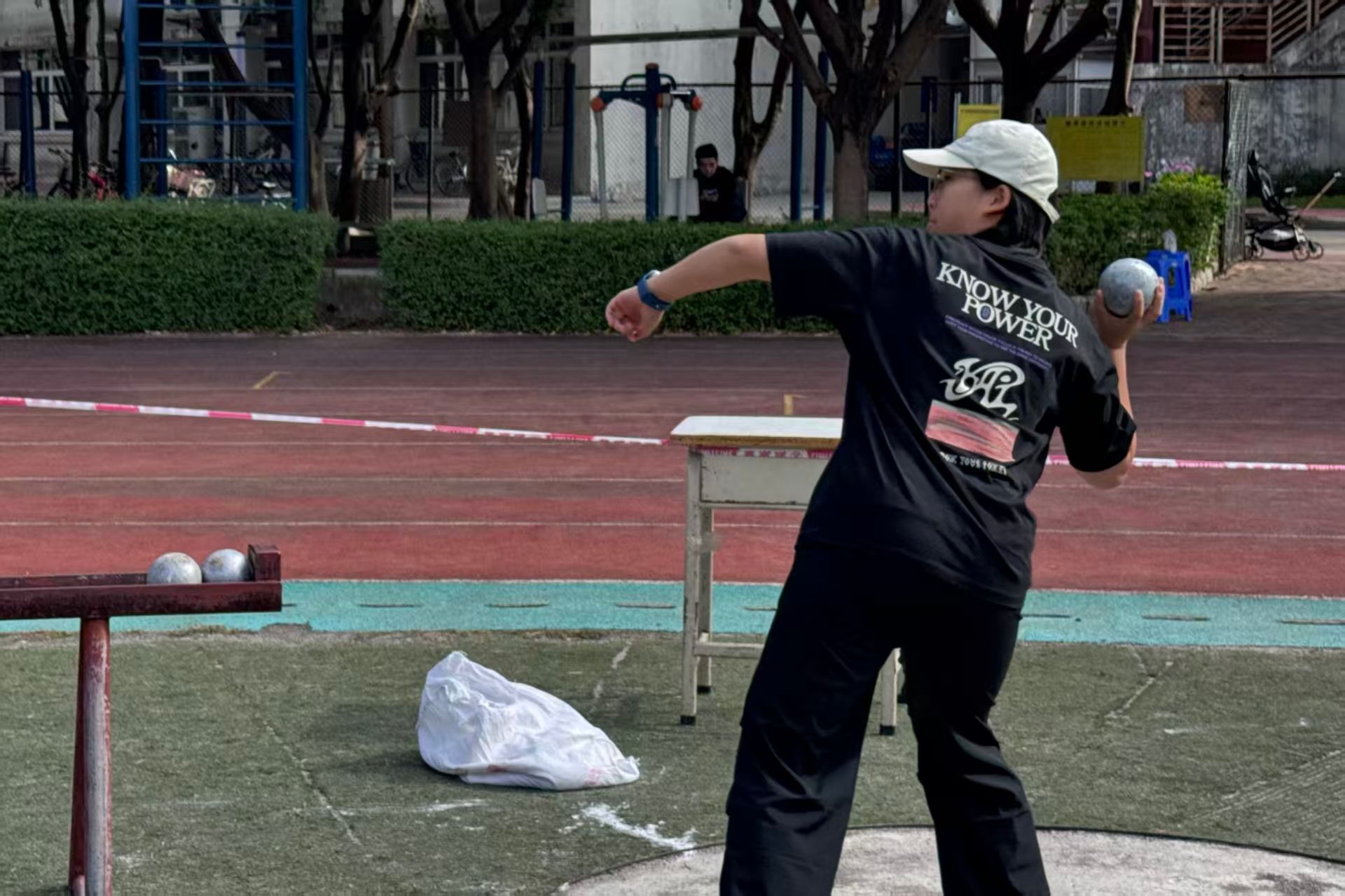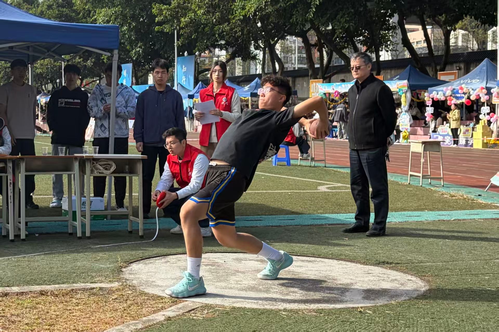 双手紧握铅球贴于颈侧,身体后倾蓄力时如拉满的弓,那稳稳砸在地面的铅球,是力量与技巧碰撞的勋章,更是少年不服输的倔强绽放。
