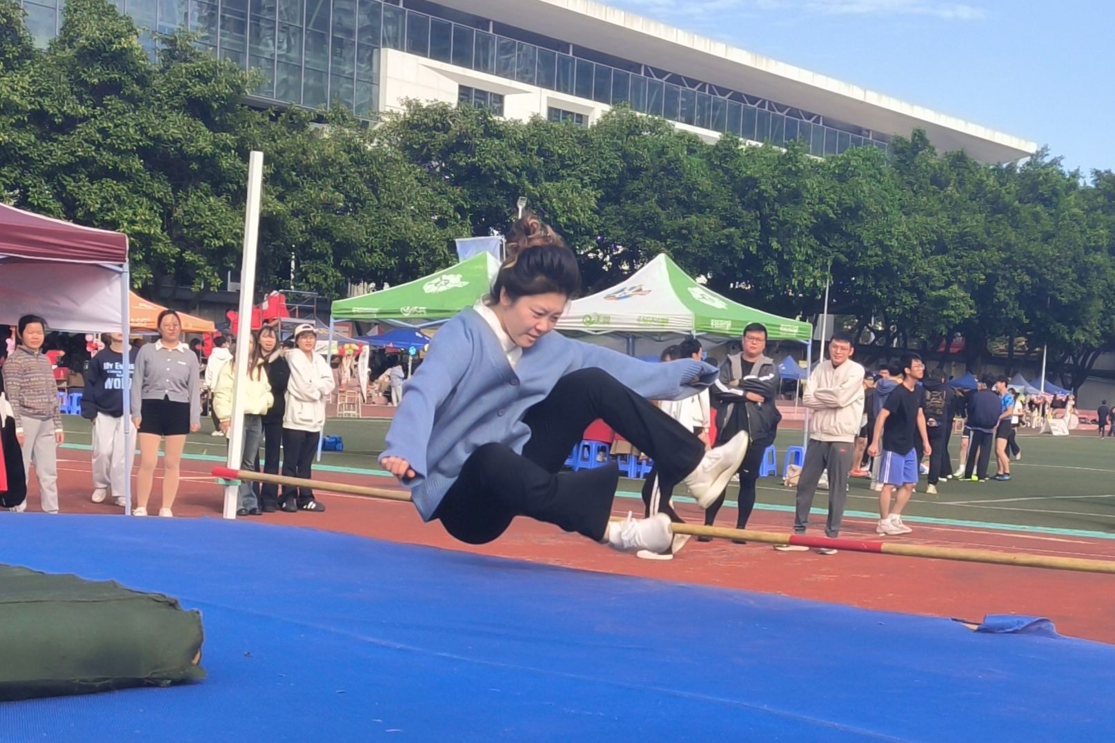 弓步蓄力时的紧绷,腾空舒展时的果敢,落地站定时的坚毅。这份不服输的倔强,在沙坑旁绽放成最耀眼的青春光芒!